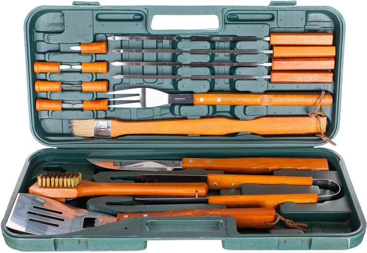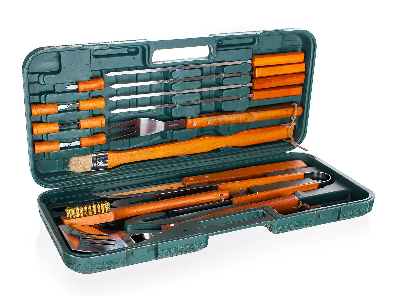 Ten uniwersalny 18‑elementowy zestaw narzędzi do grilla oferuje wszystko od łopatki i szczypiec po szpikulce i wykałaczki. Narzędzia z wysokiej jakości stali nierdzewnej z długimi drewnianymi uchwytami zapewniają bezpieczny chwyt i wygodę pracy nad żarem. Całe wyposażenie jest przejrzyście ułożone w wytrzymałej plastikowej walizce, która ułatwia przenoszenie i przechowywanie.