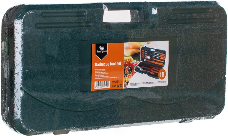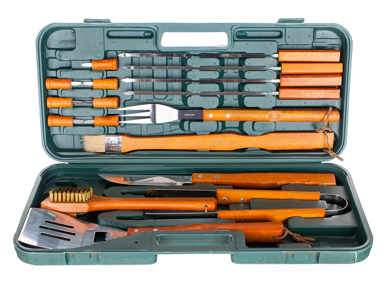 - Szczotka druciana do czyszczenia 29 cm; szczypce 34 cm; łopatka 41 cm; nóż porcjowy 44 cm; widelec z 3 zębami 40,5 cm; 4× szpikulec do grilla 40,5 cm; 8× wykałaczka 6,5 cm; pędzel 46 cm