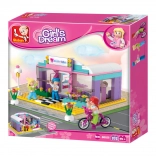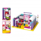 Ten kolorowy zestaw przedstawia nowoczesny salon piękności z witrynami, lustrami i miejscem do siedzenia, gdzie dzieci mogą odgrywać role wizażystek i klientek. Dzięki 3 figurkom i bogatym detalom powstają wciąż nowe scenki – od układania fryzur po przejażdżkę różowym rowerem.