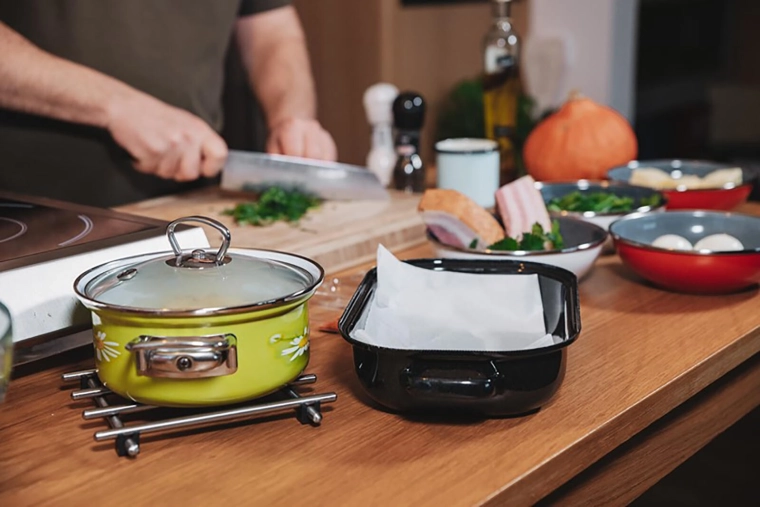 Solidna brytfanna z wysokiej jakości emalii o grubości blachy 1,2 mm oferuje długą żywotność i odporność na zarysowania. Gładka, nieporowata powierzchnia jest higieniczna, łatwa w utrzymaniu i ogranicza namnażanie bakterii. W zestawie jest pokrywa, która pomaga utrzymać wilgoć i zapewniać kruche, soczyste pieczone mięso.