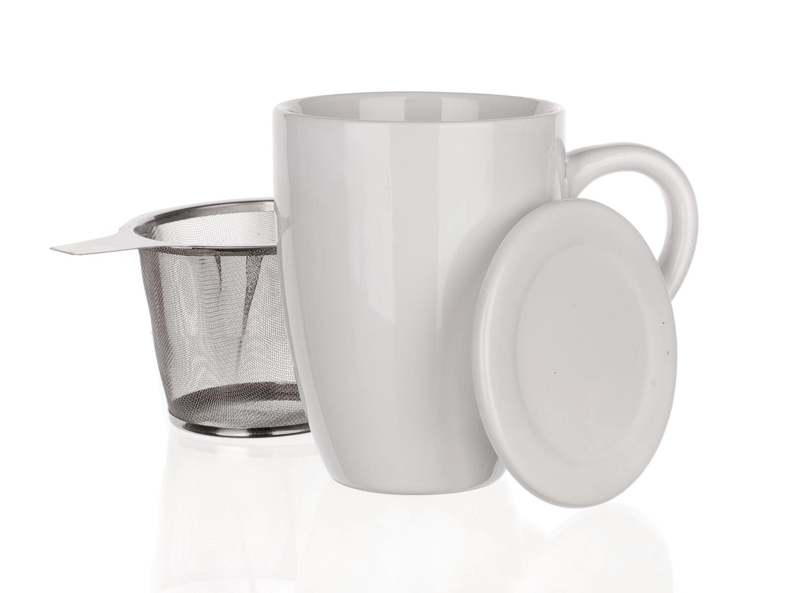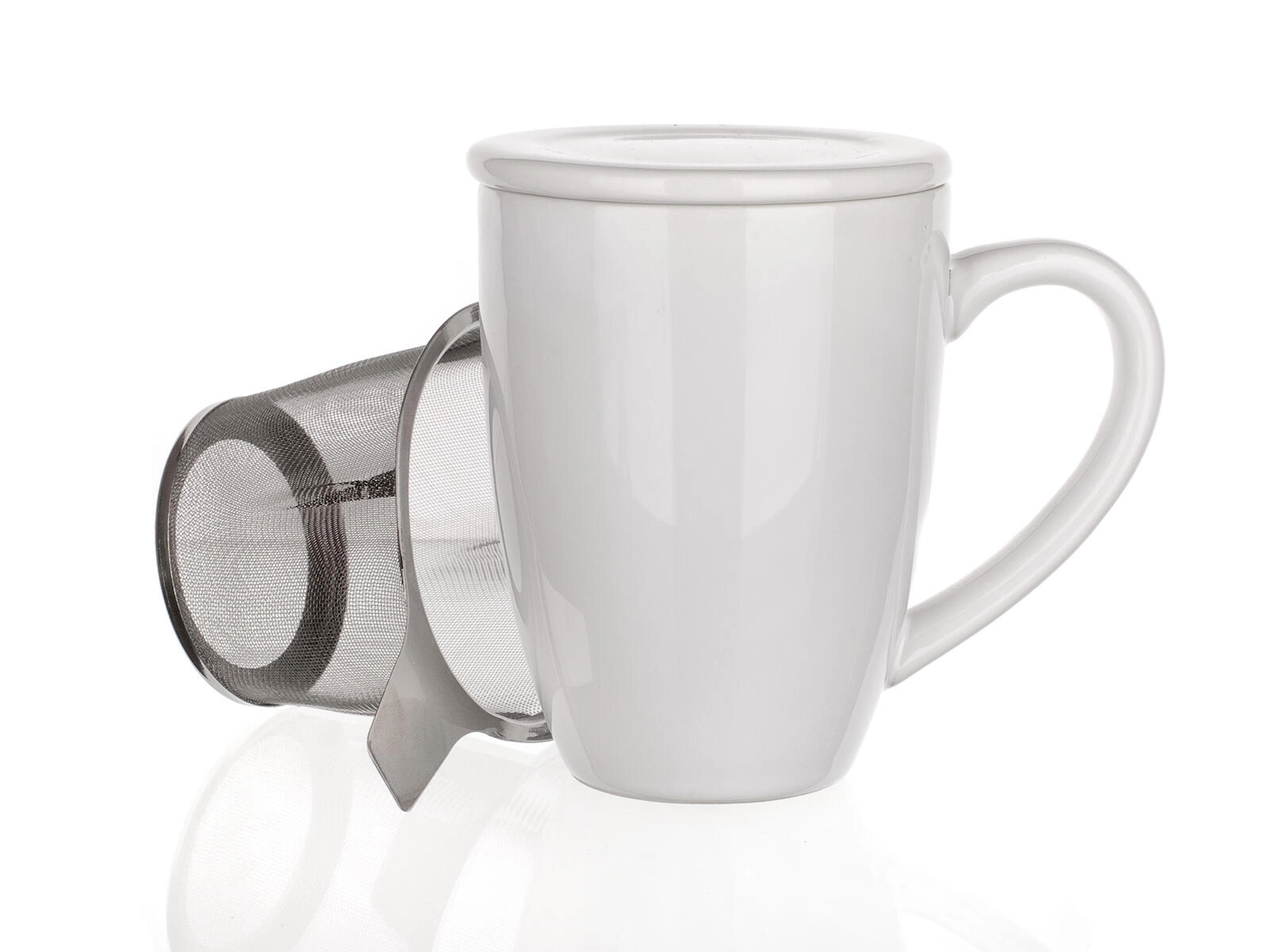 Ten biały ceramiczny kubek o pojemności 350 ml to świetny wybór dla miłośników herbat liściastych. Wyjmowane sitko ze stali nierdzewnej z drobną siatką gwarantuje czysty napar bez zanieczyszczeń, a pokrywka pomaga dłużej utrzymać napój gorący. Po zaparzaniu pokrywkę można wykorzystać także jako praktyczną podstawkę na sitko.
