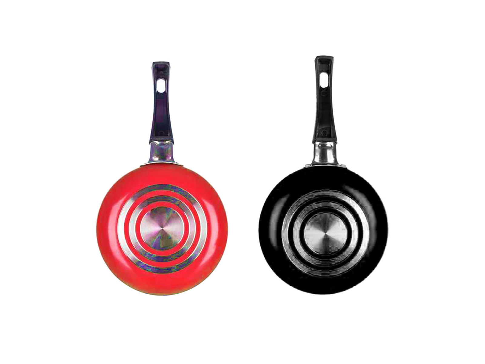 Powierzchnia zewnętrzna ma atrakcyjny mix kolorów (niebieski, fioletowy, żółty), dzięki czemu patelnia stylowo wpasuje się w każdą kuchnię. Rączka z bakelitu jest odporna na ciepło i wygodna w trzymaniu, a spiralne dno wspomaga równomierne nagrzewanie na gazie, prądzie i płycie ceramicznej. Indukcja nie jest wspierana.