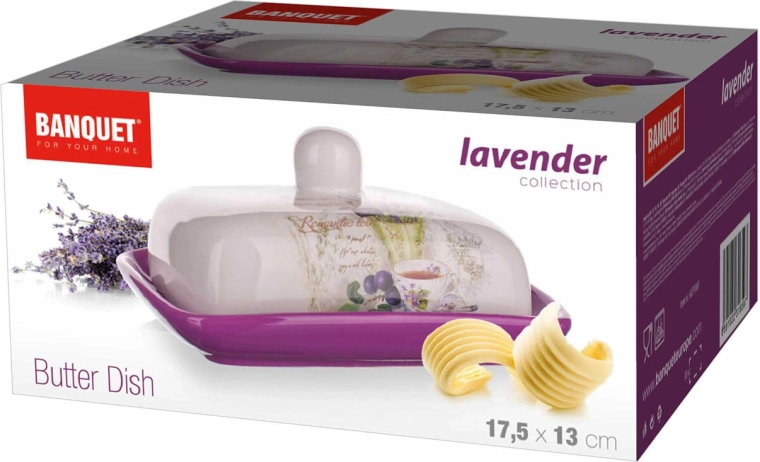 Elegancka ceramiczna maselniczka Lavender jest idealna na co dzień i na wyjątkowe okazje. Wysokiej jakości glazura w połączeniu fioletu i bieli chroni powierzchnię, ułatwia czyszczenie i podkreśla romantyczny dekor lawendy.