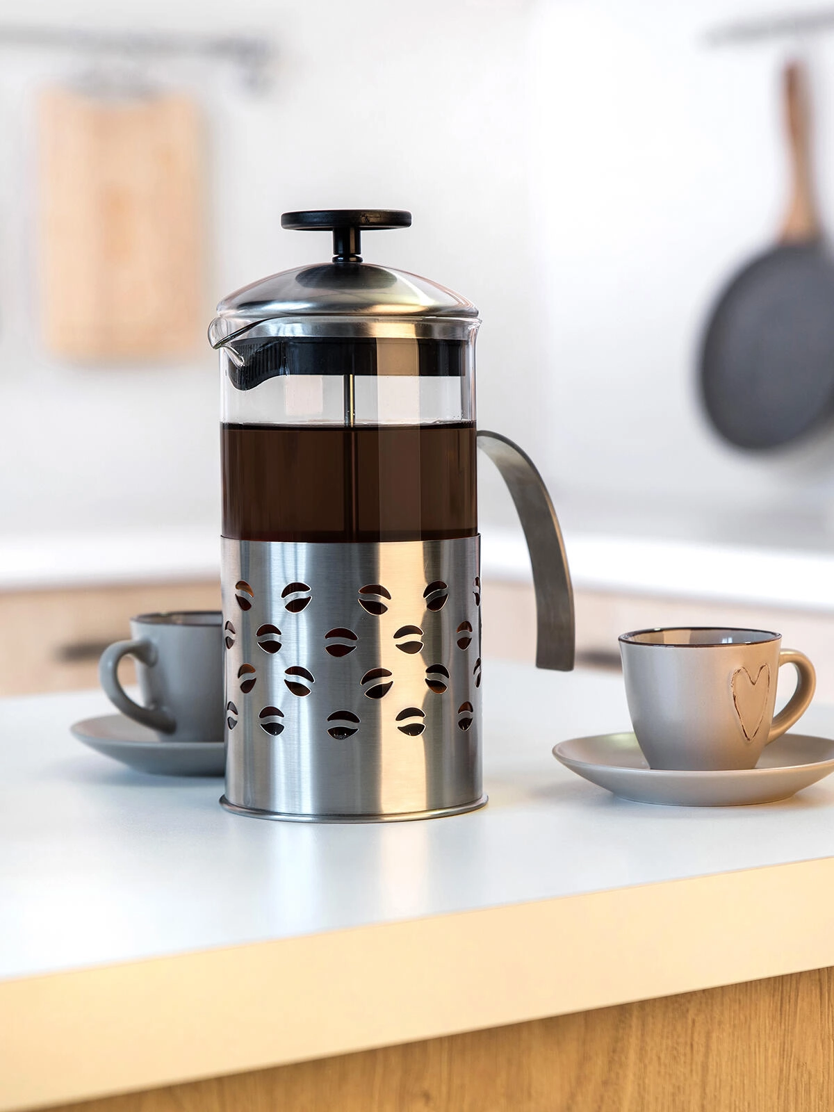 Stabilny metalowy płaszcz z wygodnym uchwytem ułatwia nalewanie i chroni szklany wkład. Odpowiedni do przygotowania kilku filiżanek jednocześnie.