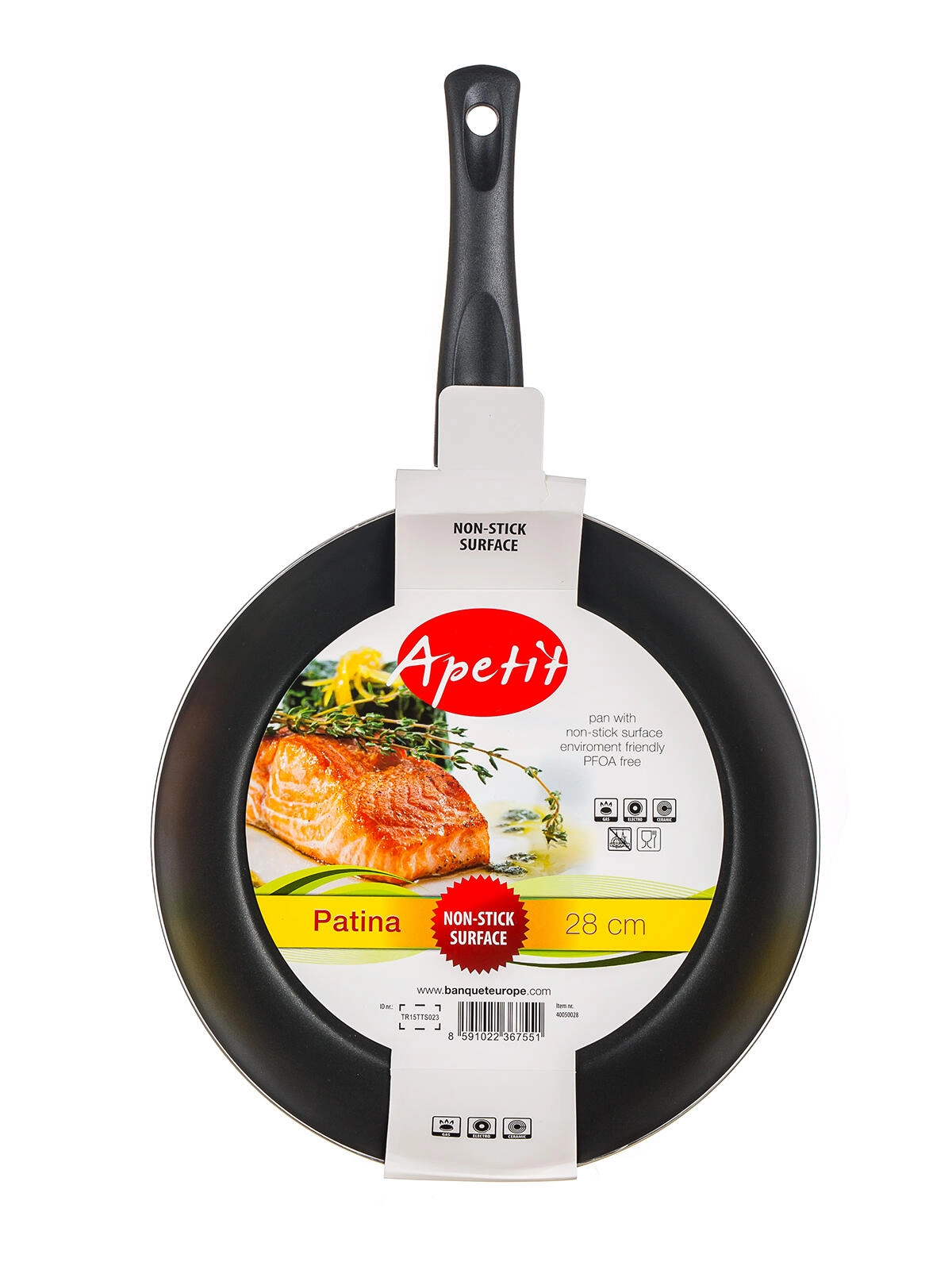 Patelnia PATINA 28 cm łączy lekki aluminiowy korpus dla szybkiego rozprowadzania ciepła oraz wysokiej jakości nieprzywierającą powłokę XYLAN, która ułatwia przygotowanie potraw i późniejsze mycie. Solidny czarny bakelitowy, nitowany uchwyt dobrze leży w dłoni i zapewnia bezpieczny chwyt.