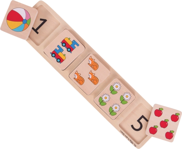 Dziecko dopasowuje elementy z obrazkami do właściwej liczby i w naturalny sposób przyswaja pierwsze pojęcia matematyczne, rozwija logikę i koncentrację.