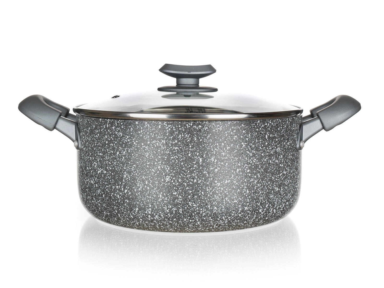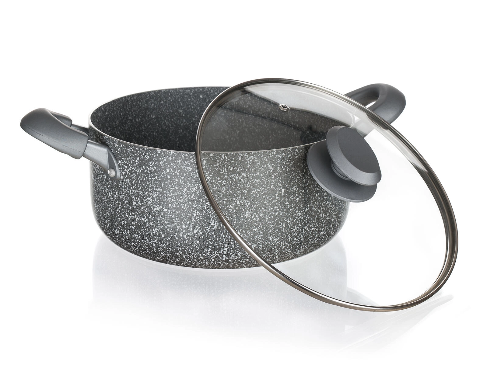 Popularny garnek z granitowym dekorem łączy nowoczesny wygląd i codzienną praktyczność. Dzięki 2‑warstwowej nieprzywierającej powłoce potrawy się nie przypalają, a czyszczenie trwa chwilę. Szklana pokrywa z zaworem pozwala kontrolować gotowanie bez zbędnej utraty ciepła.