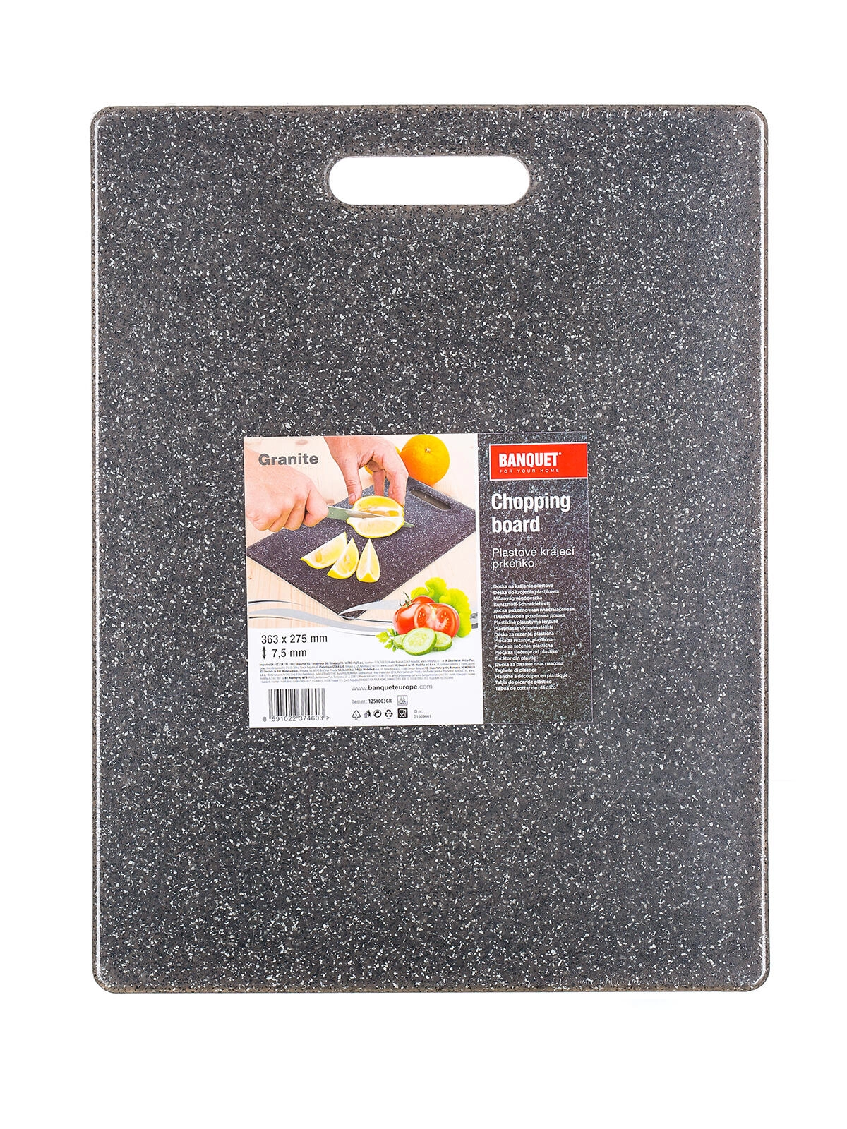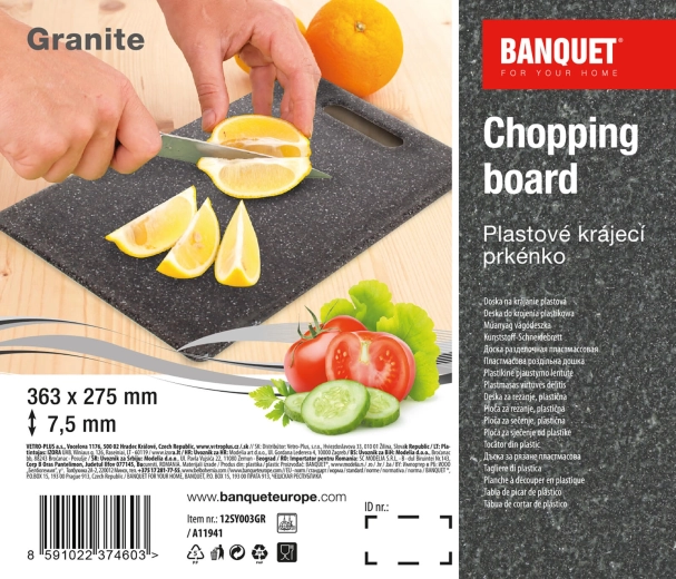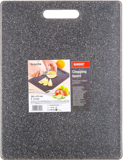 Wytrzymała plastikowa deska do krojenia GRANITE do codziennego użytku. Łatwa w utrzymaniu, delikatna dla noży i odpowiednia zarówno dla stalowych, jak i ceramicznych ostrzy. Praktyczny rozmiar 36,3 × 27,5 cm i uniwersalny szary kolor do każdej kuchni.