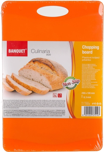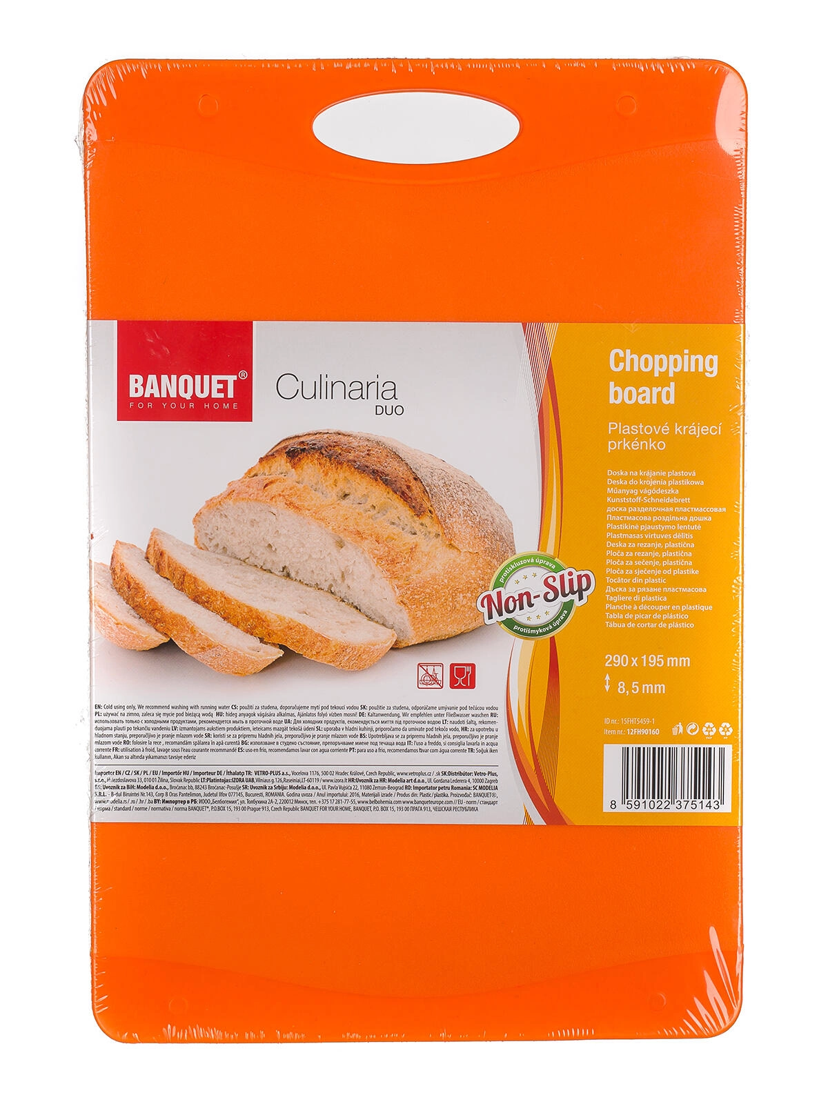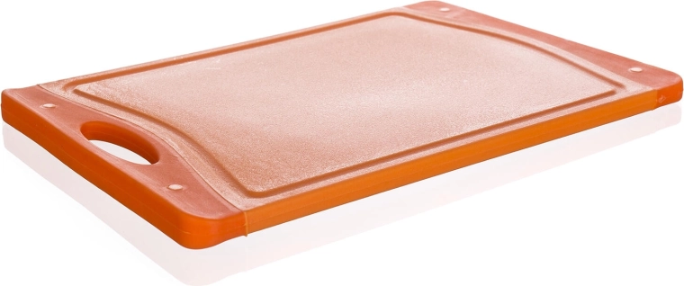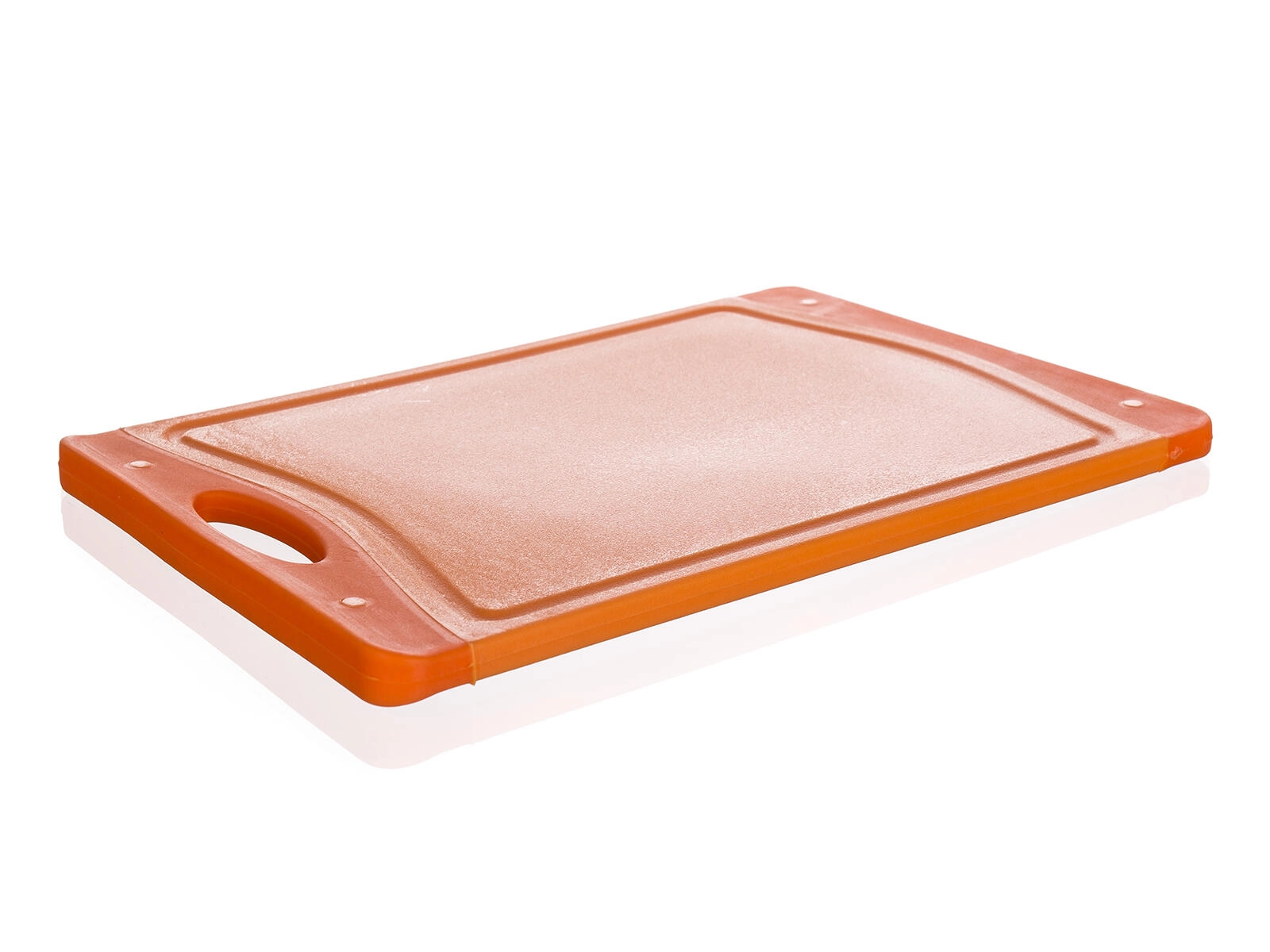 Praktyczna deska do krojenia z wytrzymałego plastiku w dwukolorowym, pomarańczowym wykończeniu, zapewniająca wygodne i bezpieczne przygotowywanie składników. Dzięki antypoślizgowemu wykończeniu, rowkowi na soki i łatwej pielęgnacji jest idealna do codziennego gotowania z nożami stalowymi i ceramicznymi.