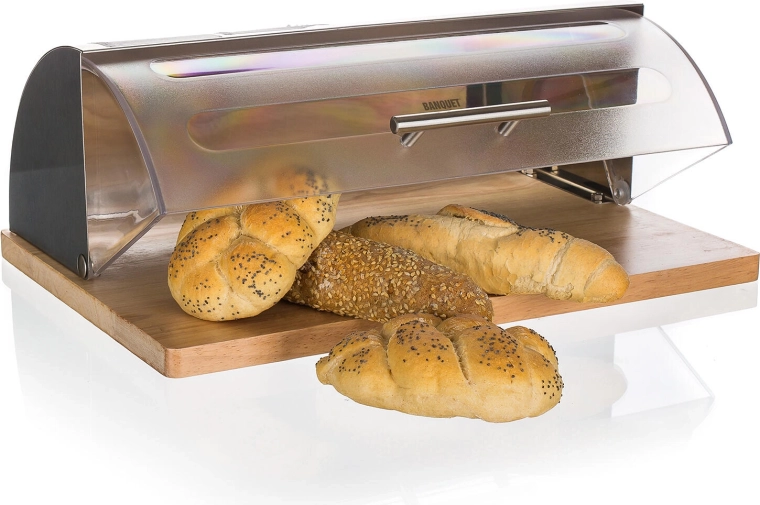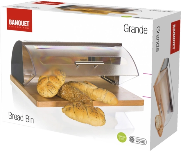 Chlebak GRANDE został zaprojektowany do bezpiecznego i higienicznego przechowywania wszystkich rodzajów pieczywa – od bochenków chleba po bułki i bagietki. Łączy stal nierdzewną 18/0 w matowym wykończeniu, wytrzymałą rolowaną plastikową pokrywę oraz masywną drewnianą podstawę z drewna kauczukowego, która dodaje stabilności i elegancji.