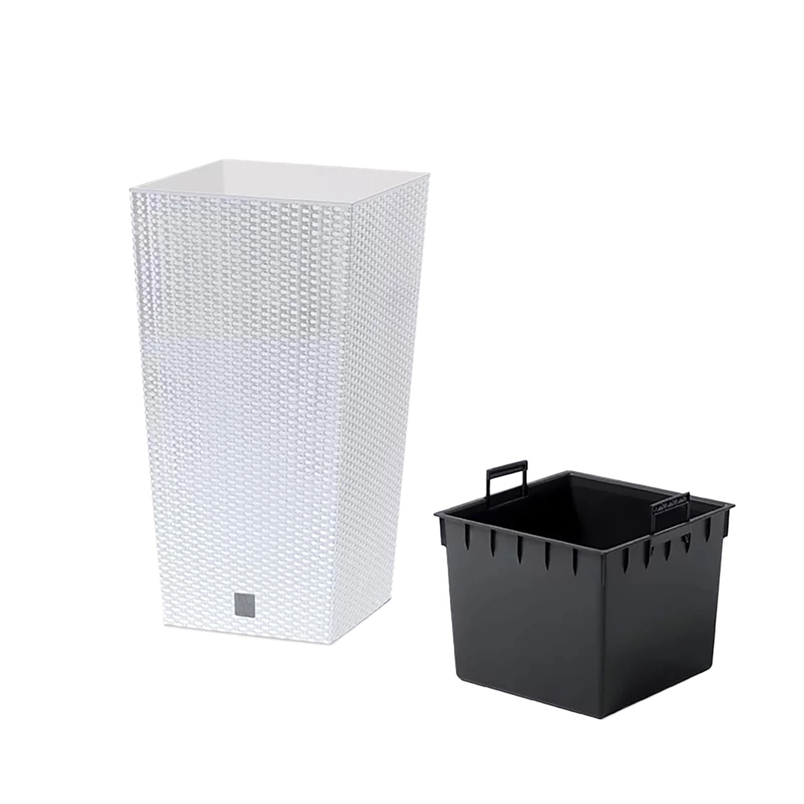 Osłonka na kwiaty Rato Square w białym kolorze łączy stylowy rattanowy wygląd z praktycznymi właściwościami plastiku. Dzięki smukłemu kształtowi doskonale wpasuje się w róg pomieszczenia, na taras i balkon, podkreślając piękno Twoich roślin.