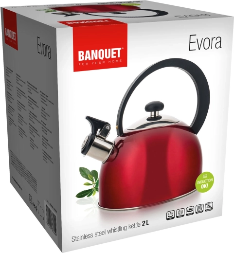 Elegancki czajnik ze stali nierdzewnej EVORA o pojemności 2 l jest idealny do codziennego gotowania wody. Oferuje gwizdek sygnalizujący wrzenie, kompatybilność ze wszystkimi typami płyt grzewczych, w tym indukcyjnych oraz bezpieczny uchwyt z bakelitu dla wygodnego nalewania.