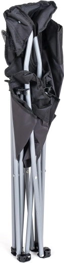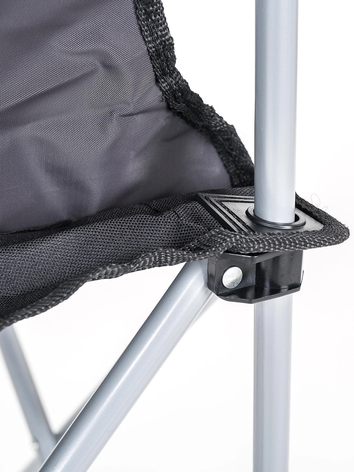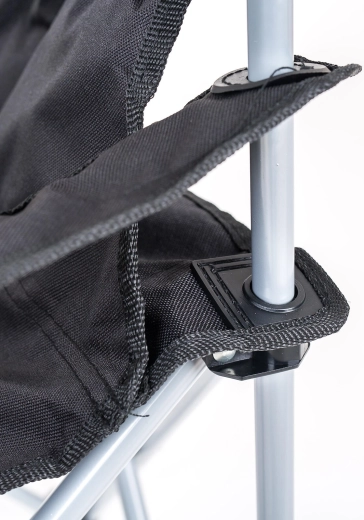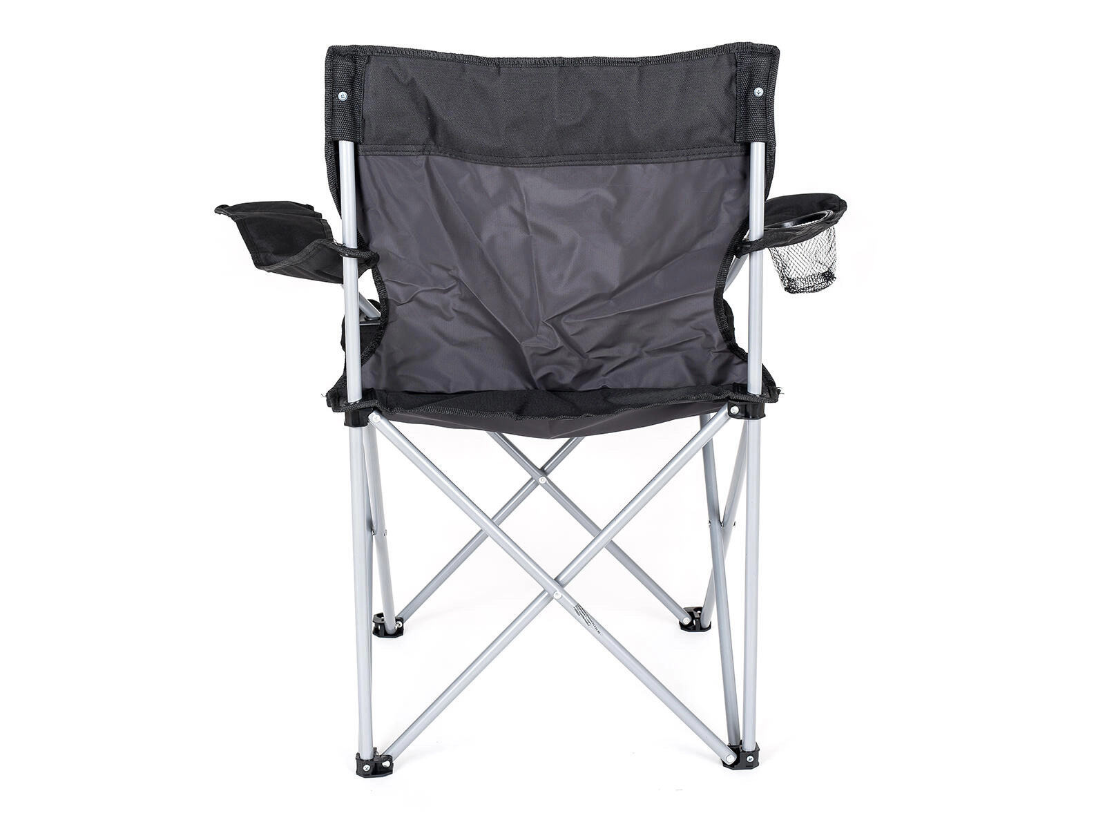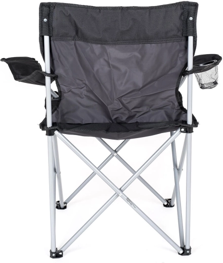 Krzesło ma wygodne podłokietniki, z których jeden wyposażono w zintegrowany uchwyt na napoje. Dzięki kompaktowym wymiarom po złożeniu łatwo mieści się w dołączonym pokrowcu transportowym i nie zajmuje miejsca w samochodzie ani w garażu.