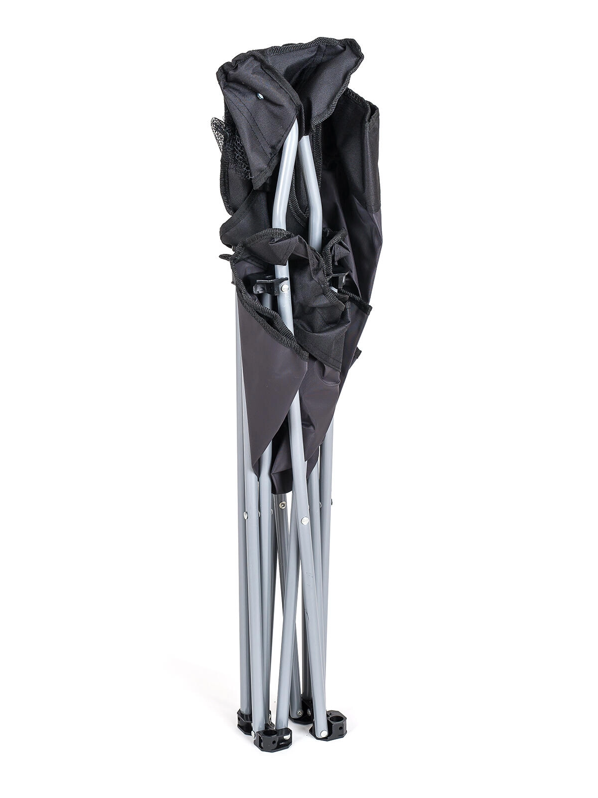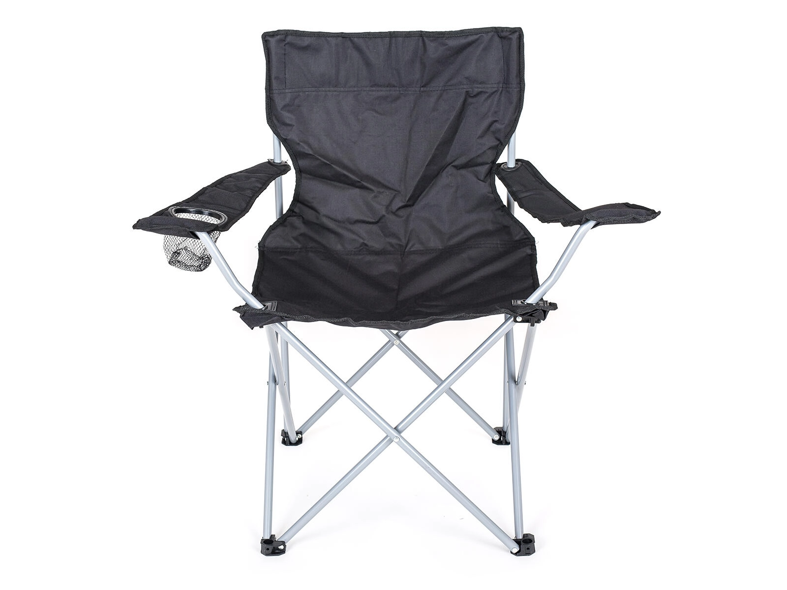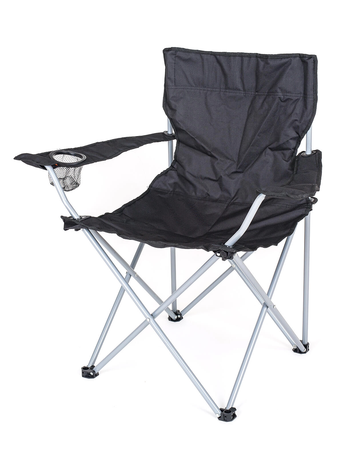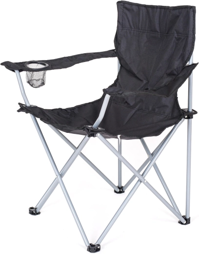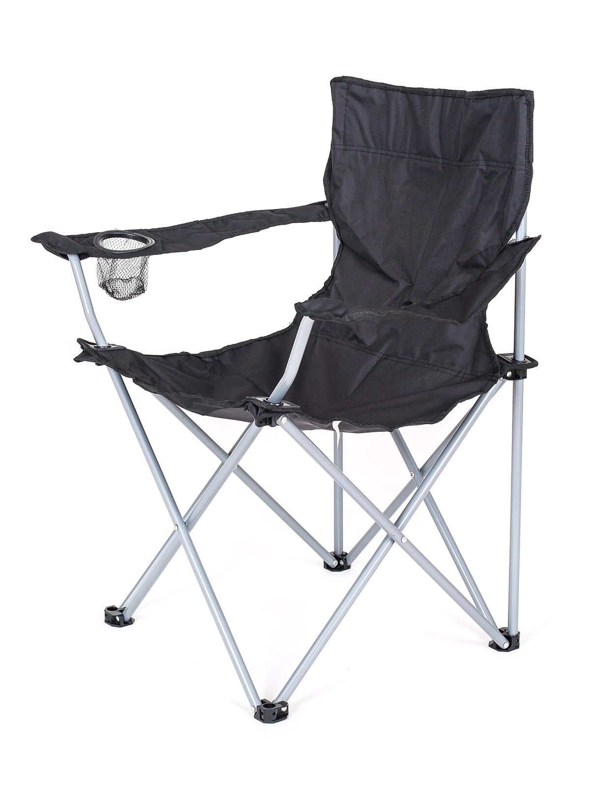 Lekkie i wytrzymałe składane krzesło kempingowe FISH w czarnym kolorze oferuje wygodne siedzenie z podłokietnikami i praktycznym uchwytem na napoje. Dzięki stalowej konstrukcji i poszyciu z poliestru 600D z powłoką PVC jest stabilne, łatwe do przenoszenia i szybkie w składaniu. Idealne na ryby, do kempingu, na działkę i festiwale.