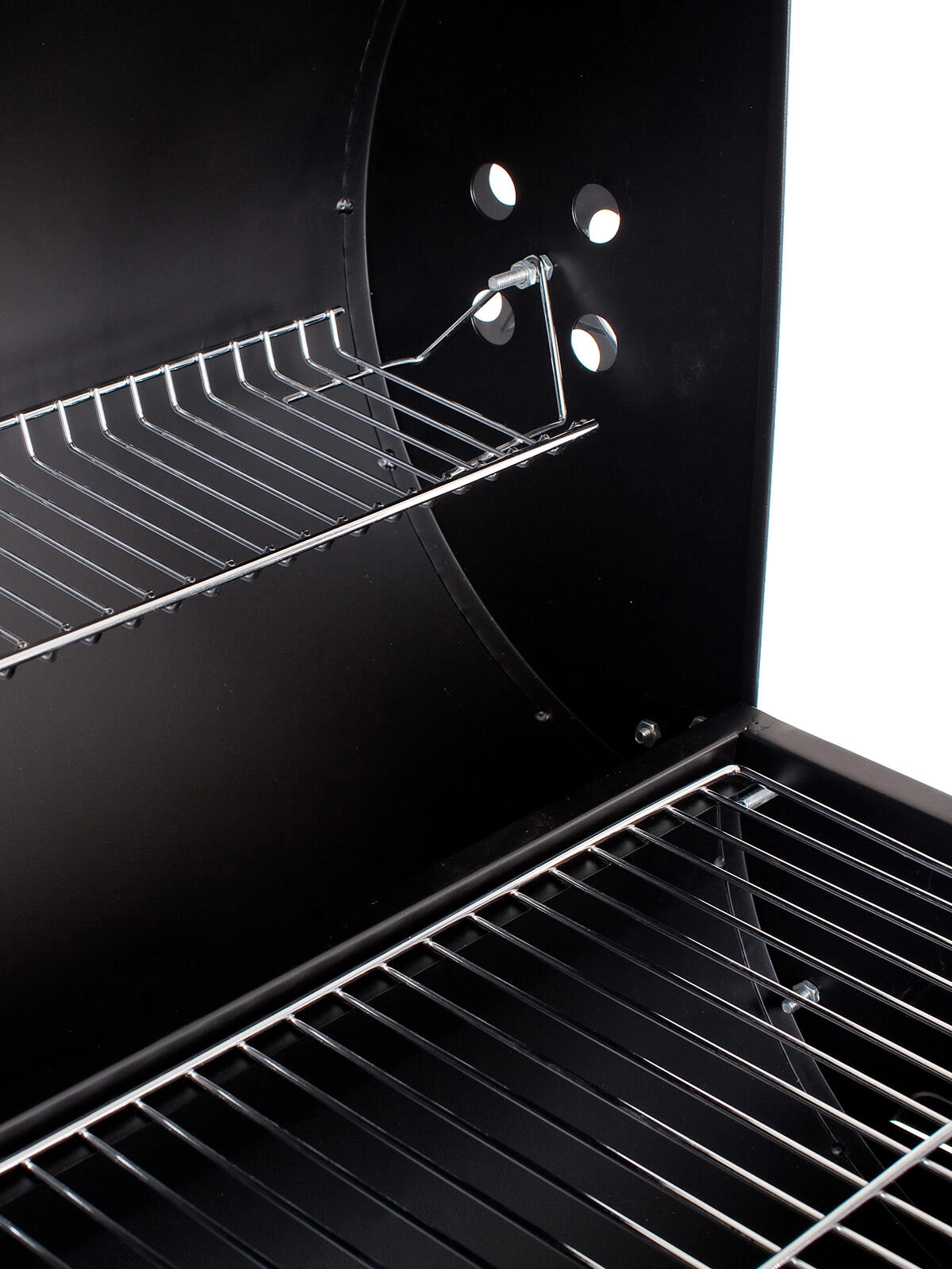 Rancher to niezawodny grill ze stali węglowej z pokrywą, łączący przestronność i trwałość. Dwa chromowane ruszty – główny do grillowania i górny podgrzewający – zapewniają elastyczność przy przygotowywaniu mięsa, warzyw oraz pieczywa. Zamykana pokrywa z wbudowanym termometrem i bocznymi przepustami powietrza umożliwia lepszą kontrolę temperatury i cyrkulacji powietrza.