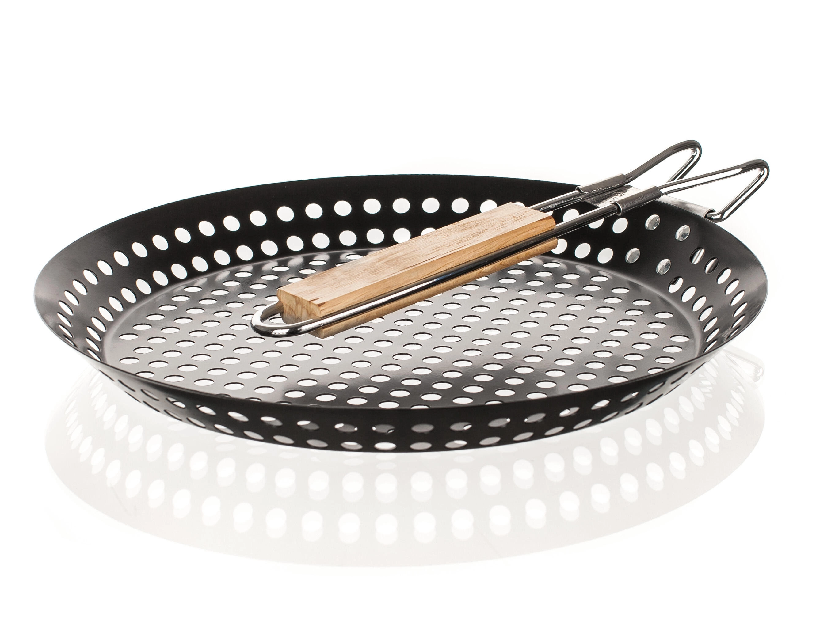 Ta okrągła patelnia grillowa łączy wytrzymałą stal i nieprzywierającą powłokę, co ułatwia przewracanie i serwowanie bez przypalania. Perforacje umożliwiają idealną cyrkulację ciepła i dymu, dzięki czemu potrawy zyskują typowy grillowy aromat i równomiernie się dopiekają.
