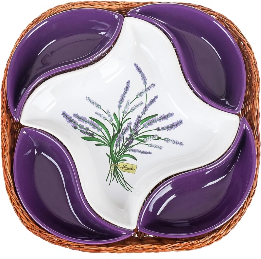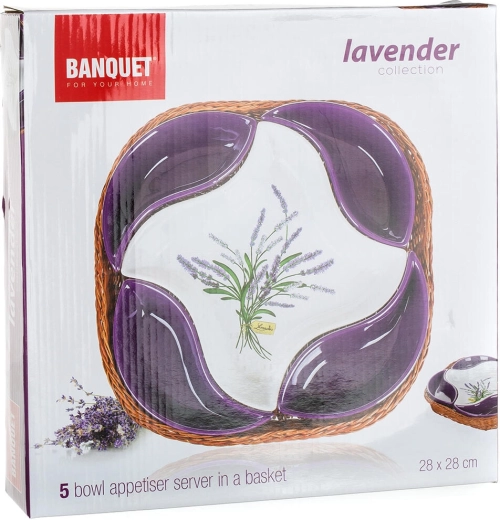 - 4 × mała fioletowa ceramiczna miska, 1 × duża ceramiczna miska z motywem lawendy, 1 × wiklinowy koszyk