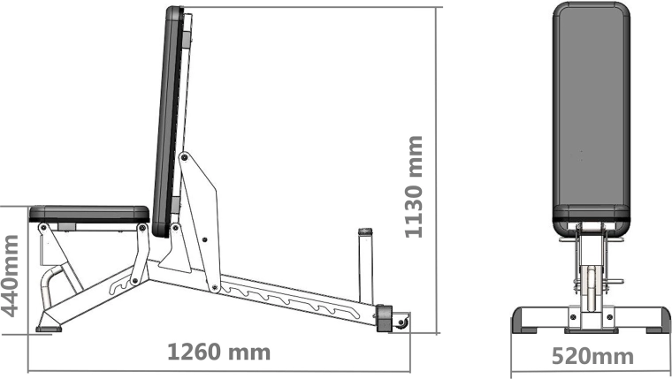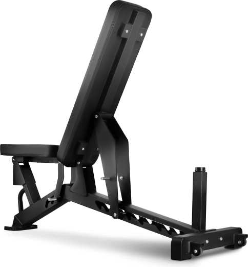 Ławka jest praktyczna do mniejszych przestrzeni – kółka transportowe i uchwyt ułatwiają przestawianie, a antypoślizgowe stopki stabilnie trzymają ławkę na miejscu. Półkomercyjna konstrukcja łączy trwałość i długą żywotność, dzięki czemu sprawdzi się zarówno w domowej siłowni, jak i w klubach czy mniejszych studiach.