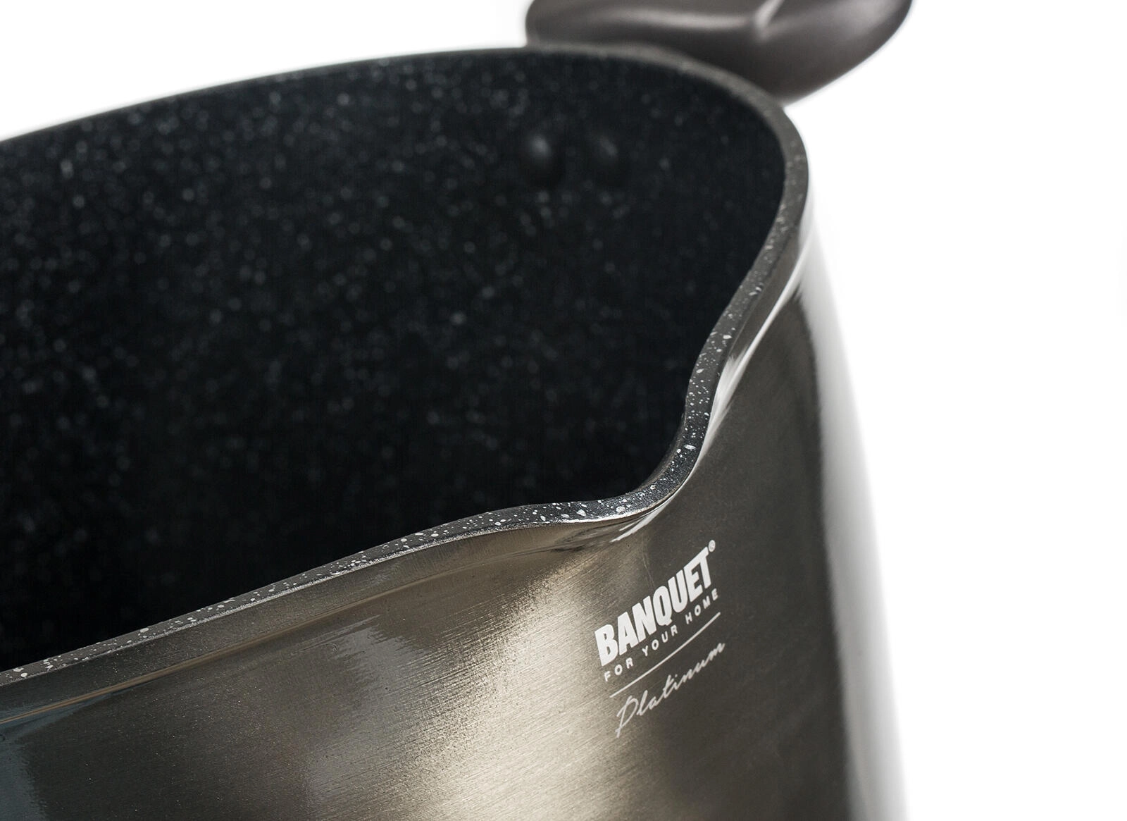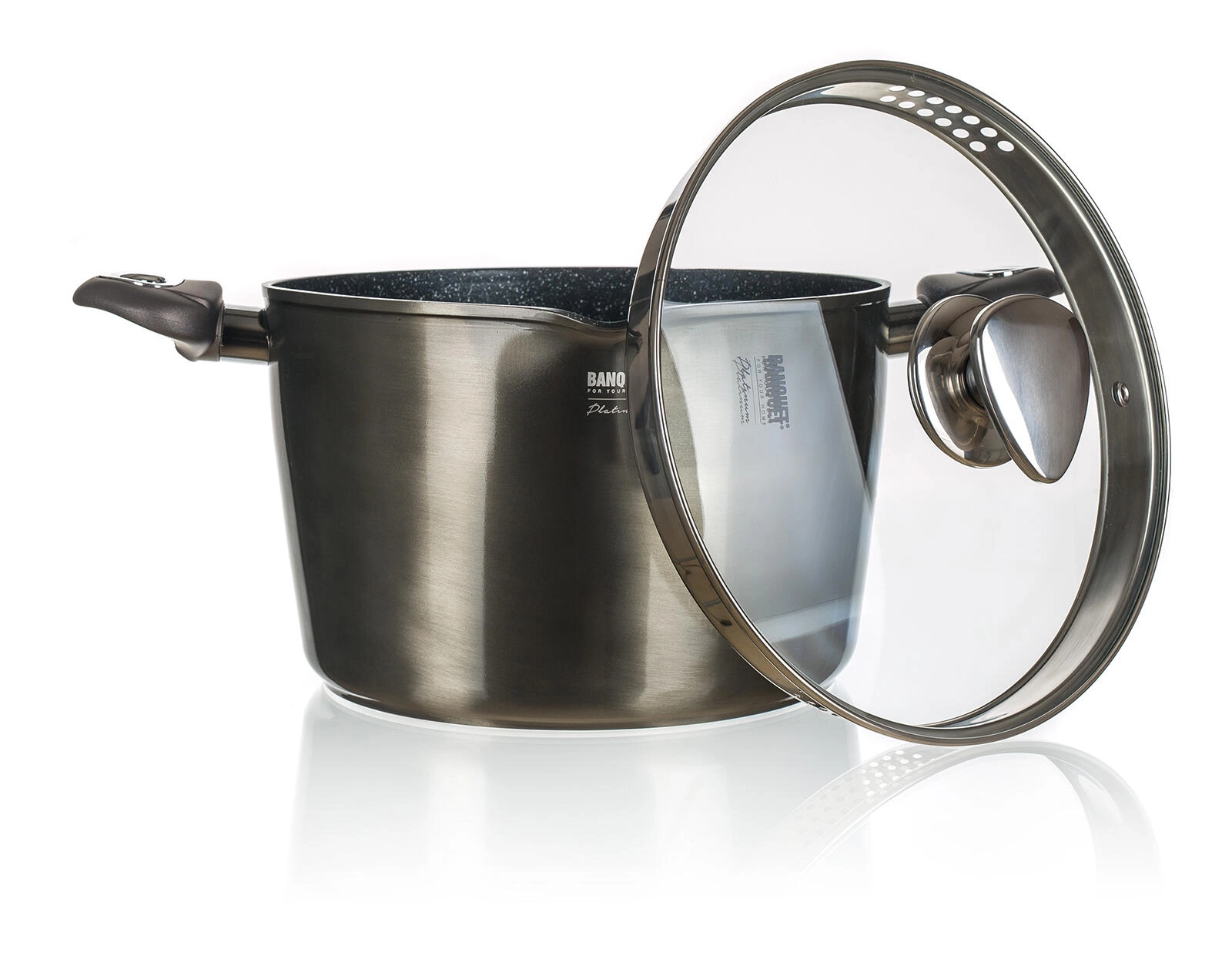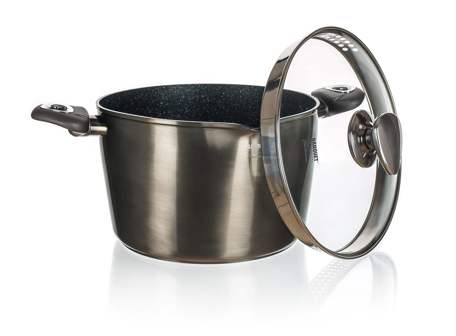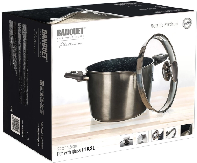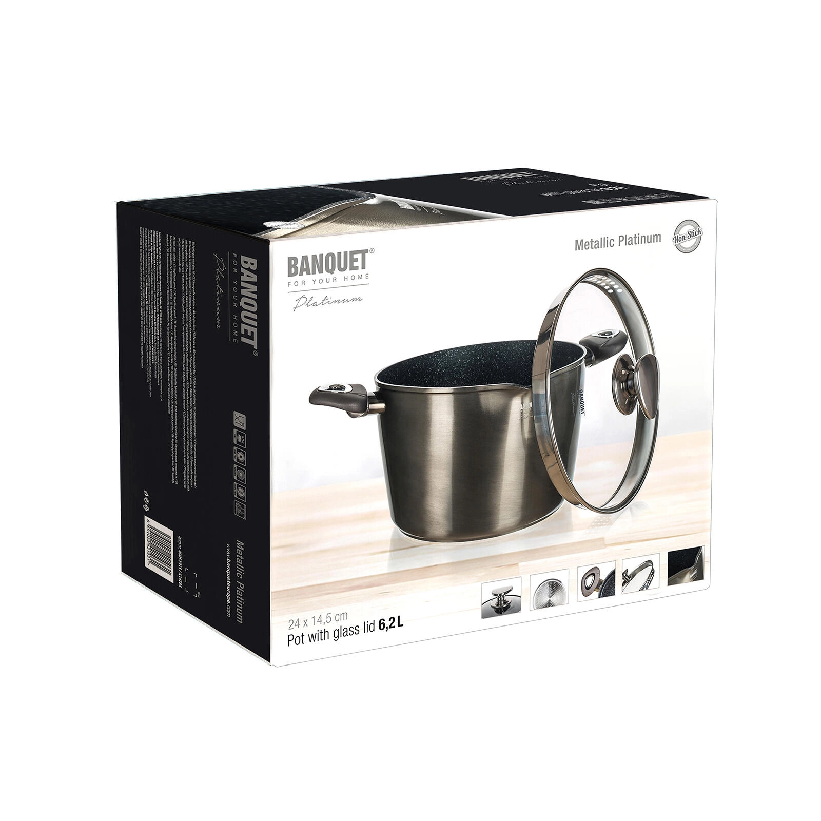 Solidny odlewany aluminiowy garnek METALLIC PLATINUM o pojemności 6,2 l i średnicy 24 cm oferuje nieprzywierającą i bardzo odporną powłokę, w pełni indukcyjne dno dla szybkiego nagrzewania oraz praktyczny dzióbek do łatwego odlewania. Szklana pokrywka z zaworem umożliwia kontrolę gotowania, a uchwyty soft‑touch i stalowy uchwyt pokrywki zapewniają wygodne i bezpieczne użytkowanie.