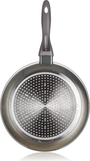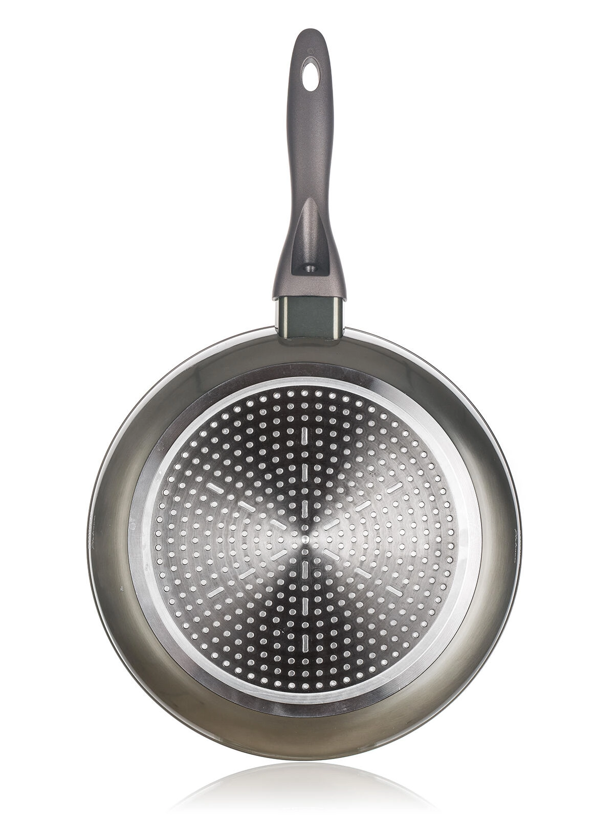 W pełni indukcyjne dno szybko i równomiernie się nagrzewa, oszczędzając czas i energię. Zewnętrzna karbonowa metaliczna powłoka nadaje patelni nowoczesny wygląd, a ergonomiczna rączka soft‑touch zapewnia pewny i przyjemny chwyt nawet podczas dłuższego gotowania.