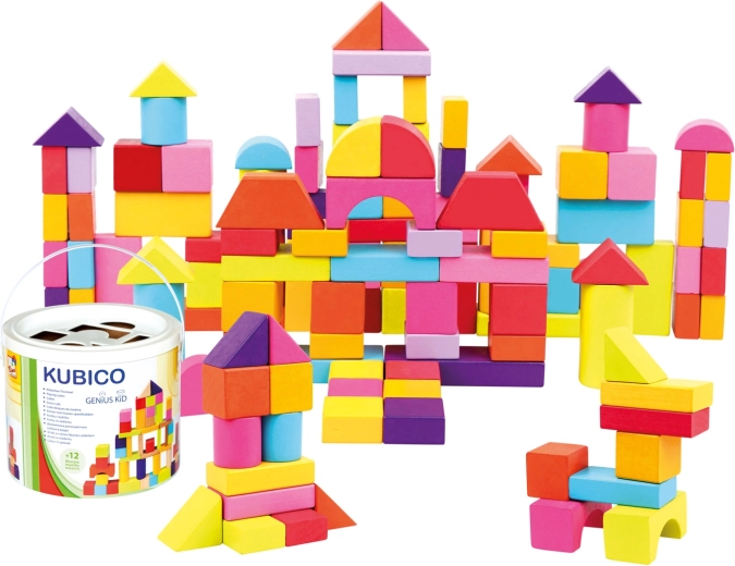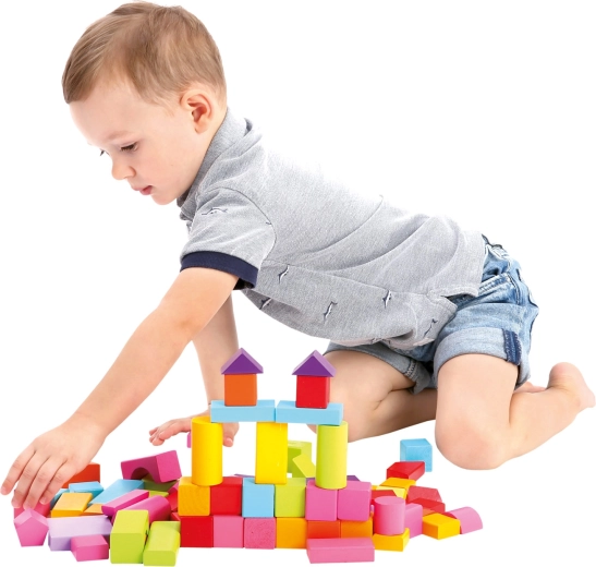 Zestaw zawiera klocki o różnych kształtach – sześciany, prostopadłościany, walce, łuki i trójkąty – w żywych kolorach, które wspierają kreatywną i otwartą zabawę.
