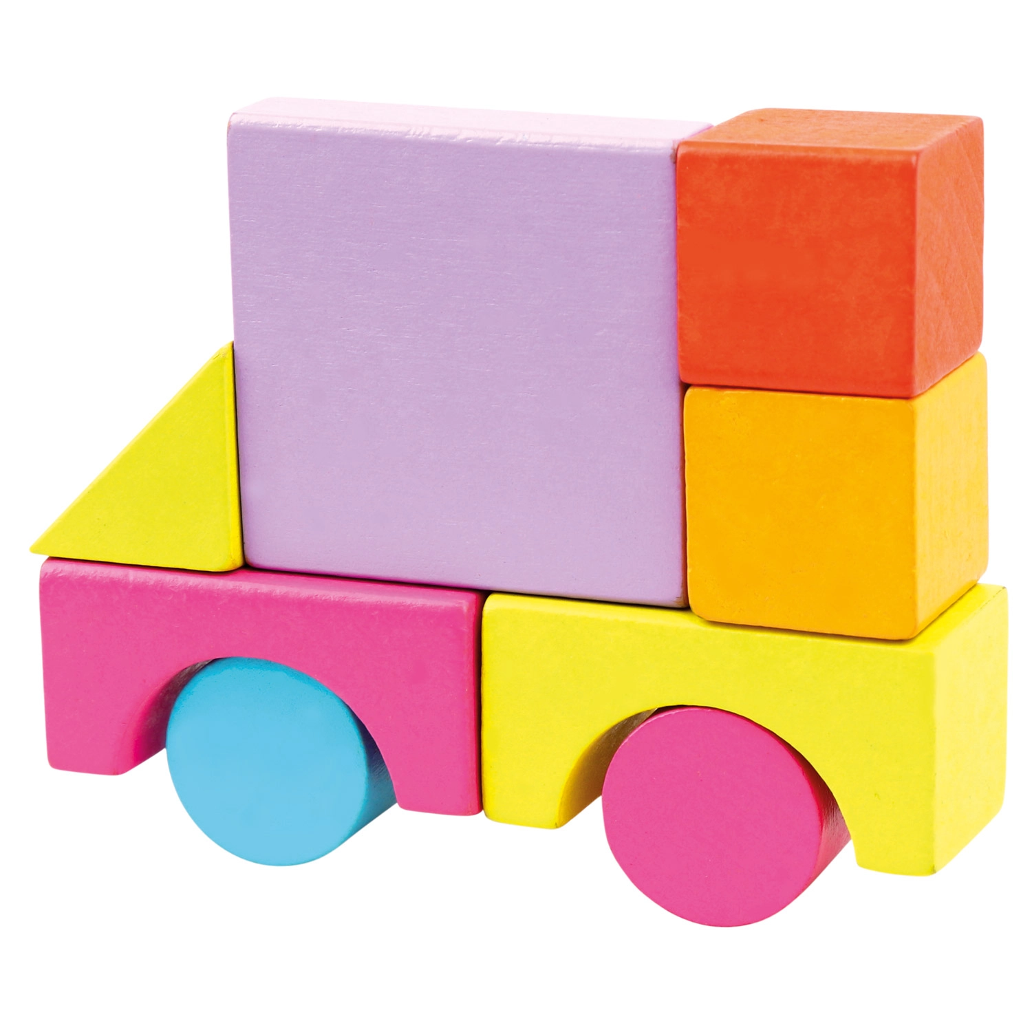 Idealny dla dzieci od 1 roku: klocki mają przyjemnie gładką powierzchnię, intensywne, bezpieczne kolory i zróżnicowane kształty – od sześcianów i prostopadłościanów po walce, łuki i trójkąty. Zabawa klockami wspiera rozwój percepcji przestrzennej, kreatywności oraz koordynacji oko–ręka.