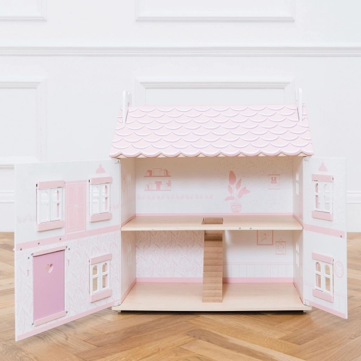 Luksusowy trzypiętrowy dom w romantycznym różowo-białym wydaniu zachwyca połyskującym, karbowanym dachem, serduszkami i barwnymi dekoracjami wnętrz w każdym pokoju. Otwierane okna i okiennice zapraszają dzieci do świata opowieści, a stabilna drewniana konstrukcja gwarantuje długą żywotność. Domek jest dostarczany bez wyposażenia, dzięki czemu dzieci mogą uzupełnić go mebelkami i figurkami według własnego stylu.