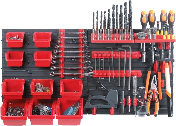 Montaż na ścianie jest szybki i prosty, system idealnie sprawdzi się w garażach, warsztatach i domowych kącikach majsterkowicza. Wyjmowane pojemniki ułatwiają pracę z drobnym materiałem, a uniwersalne sloty mieszczą haczyki, uchwyty na narzędzia i stojaki na bity.