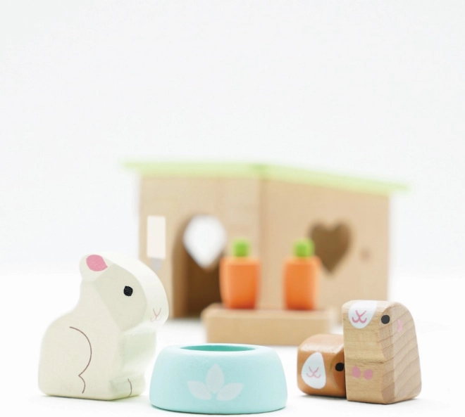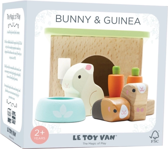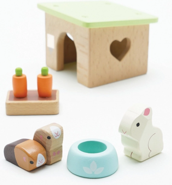 Uroczy drewniany zestaw domowych pupili od LE TOY VAN zawiera króliczka, dwie świnki morskie, budkę, miskę oraz marchewkowe przekąski na godziny kreatywnej zabawy w odgrywanie ról. Wykonany z zrównoważonego drewna FSC, ręcznie wykończony nietoksycznymi farbami na bazie wody – bezpieczny i stylowy wybór dla dzieci od 2 lat.