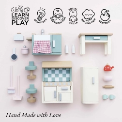 Idealna kuchnia do domku dla lalek od Le Toy Van. Ten piękny drewniany zestaw zawiera wszystko, czego potrzebujesz do miniaturowych kulinarnych przygód - zlewozmywak, kuchenkę, piekarnik, lodówkę i stół z krzesłami. Wszystko ręcznie wykonane z odnawialnych materiałów.
