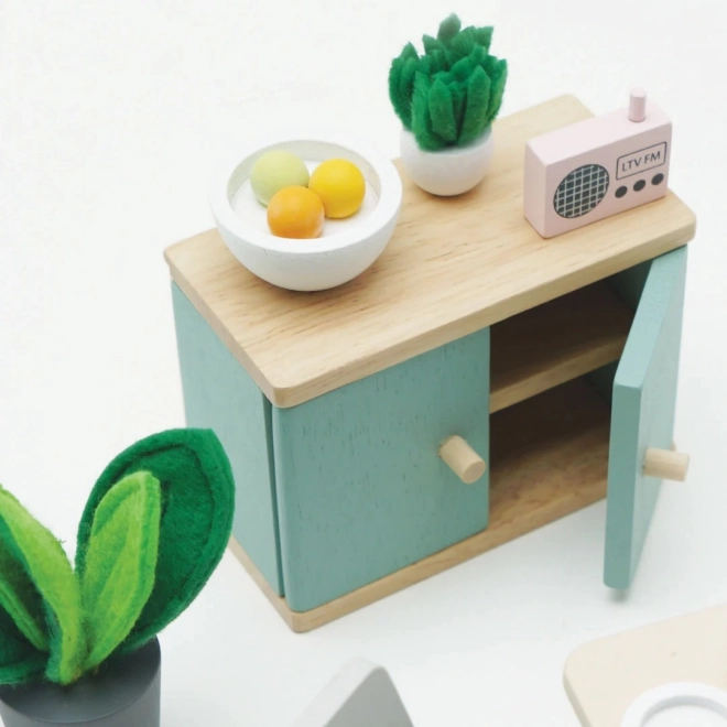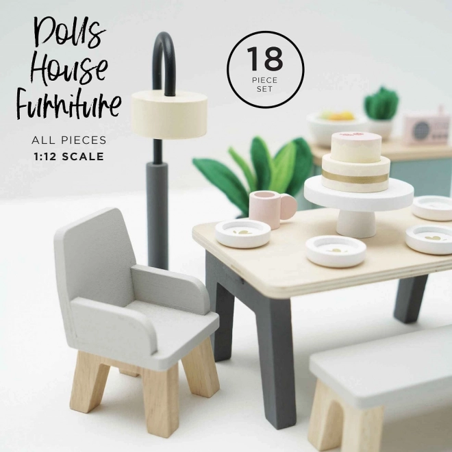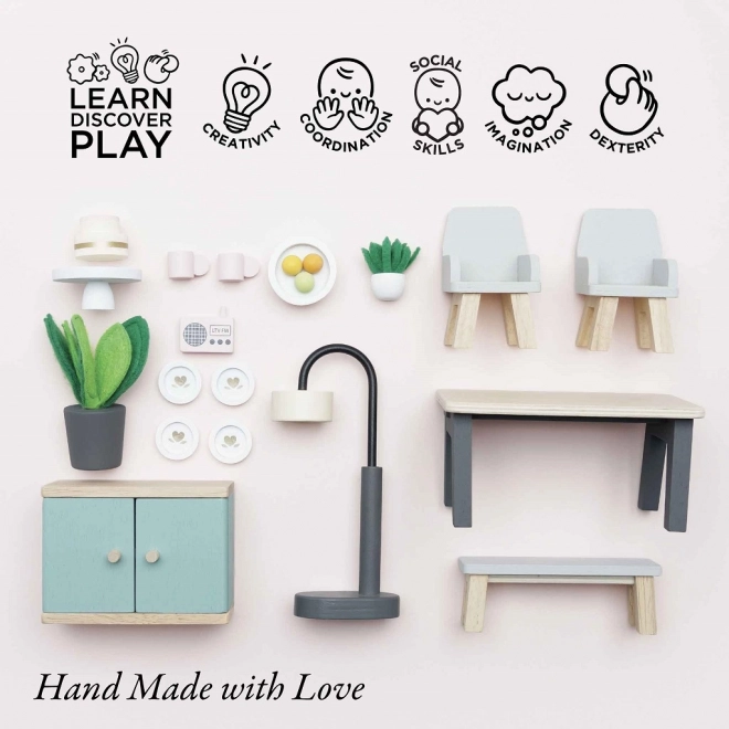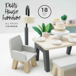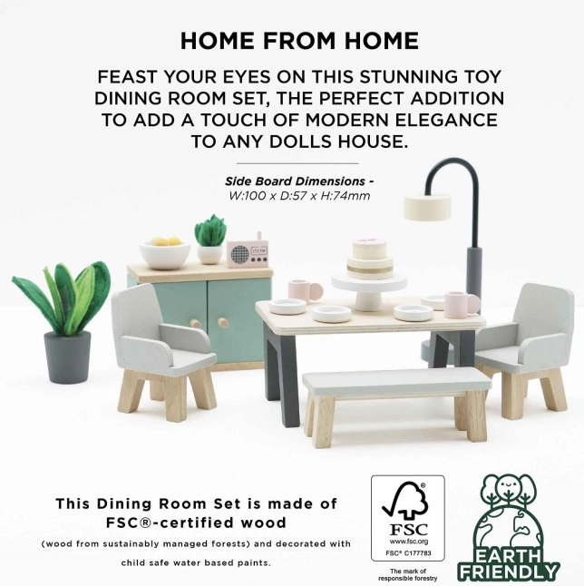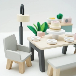 Ten urokliwy zestaw jadalniany wykonany jest z wysokiej jakości drewna z certyfikacją FSC i wnosi do każdego domku dla lalek odrobinę wyrafinowania. Zawiera 18 elementów, w tym stół, dwa krzesła, ławkę, lampę, kredens oraz dekoracyjne dodatki, takie jak rośliny, misa z owocami i tort. Ten zestaw nie tylko wygląda pięknie, ale także wspiera rozwój zdolności poznawczych i komunikacyjnych dzieci. Jest dekorowany za pomocą nietoksycznych farb na bazie wody i jest kompatybilny z innymi domkami Le Toy Van Dolls.
