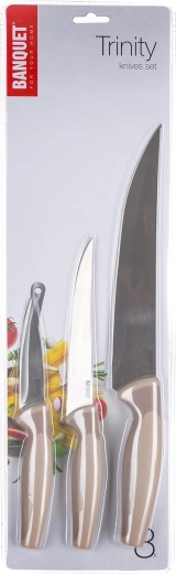 Z tym 3-częściowym zestawem noży TRINITY CULINARIA poradzisz sobie ze wszystkim: od delikatnego krojenia po porcjowanie mięsa. Stalowe ostrza zapewniają ostre i stabilne cięcie, a wygodne rękojeści w brązowym kolorze ułatwiają codzienną pracę w kuchni.