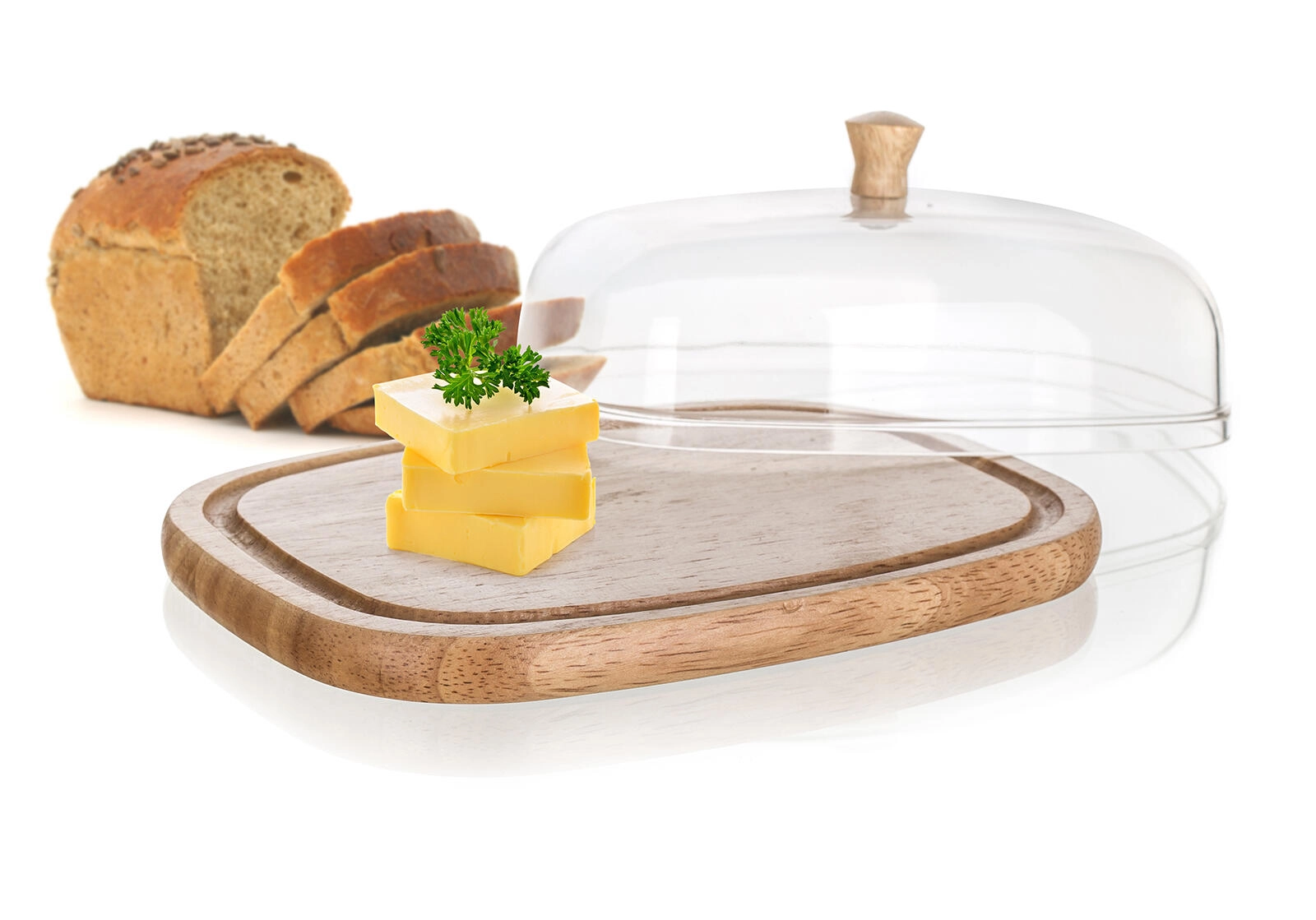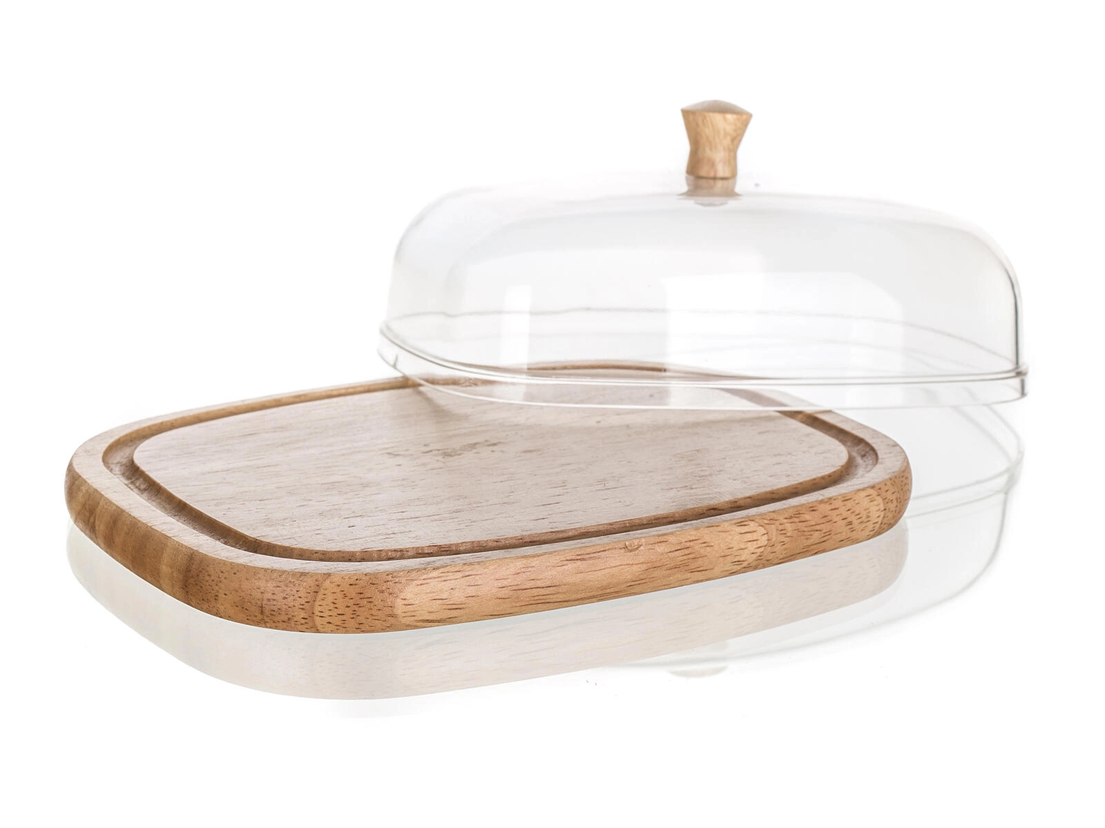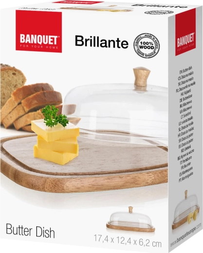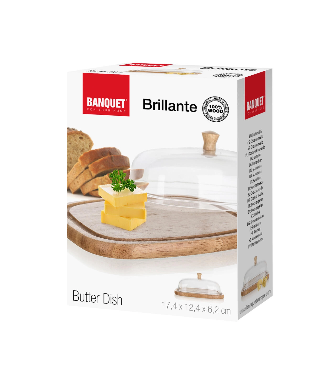 Stylowy pojemnik na masło i sery BRILLANTE to praktyczny dodatek do każdej kuchni i jadalni. Przezroczysta akrylowa pokrywa z drewnianym uchwytem chroni żywność przed wysychaniem i niepożądanymi zapachami, a naturalne drewno kauczukowe tacy nadaje serwowaniu ciepły, nowoczesny charakter.