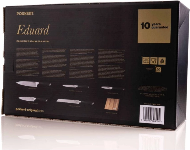 Zadbaj o precyzyjne krojenie na co dzień z zestawem noży EDUARD z wysokiej jakości niemieckiej stali X50CrMoV15 i eleganckim magnetycznym bambusowym blokiem. Ostro zakończone ostrza z idealnym kątem ostrzenia zapewniają dokładne i łatwe cięcie pieczywa, mięsa i warzyw, wytrzymała rękojeść świetnie leży w dłoni, a osłona na palec zwiększa bezpieczeństwo pracy.