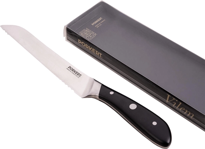 Nóż do pieczywa Vilem to niezawodny pomocnik do codziennego krojenia chleba, bagiet i domowego pieczywa. Ostrze ze stali X50CrMoV15 (ISO 1.4116) wyróżnia się odpornością na korozję, stabilnością krawędzi i wyważeniem dla komfortowego użytkowania. Połączenie wysokiej jakości stali i ergonomicznej rękojeści zapewnia czyste cięcia bez zgniatania miękiszu.