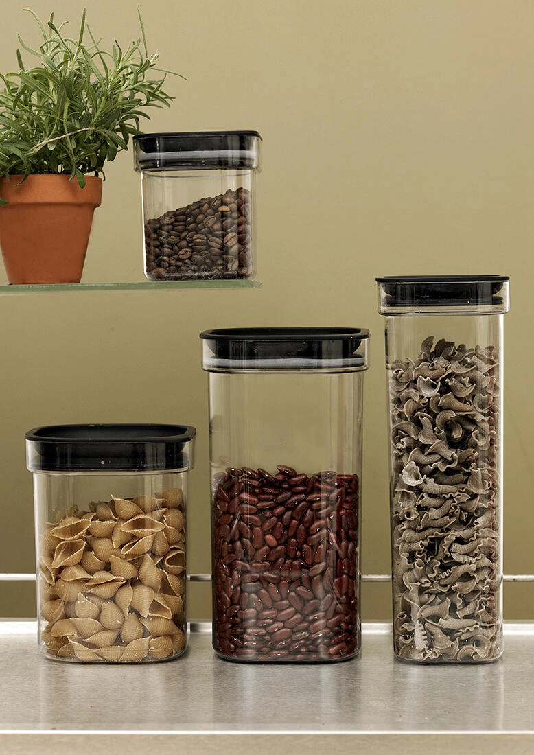 Płaska pokrywka i modułowy kształt umożliwiają stabilne ustawianie kilku pojemników jeden na drugim oraz przejrzystą organizację spiżarni.