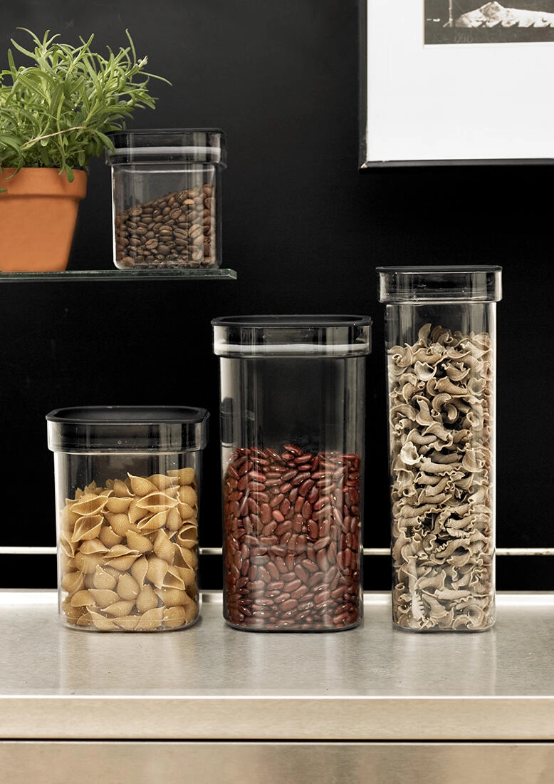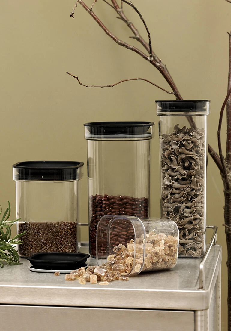 Dzięki przezroczystemu korpusowi zawsze dokładnie widzisz zawartość i pozostałą ilość. Płaska, czarna pokrywka nadaje się do piętrowania kilku pojemników, co ułatwia utrzymanie porządku na półce i w szufladzie oraz maksymalne wykorzystanie przestrzeni.