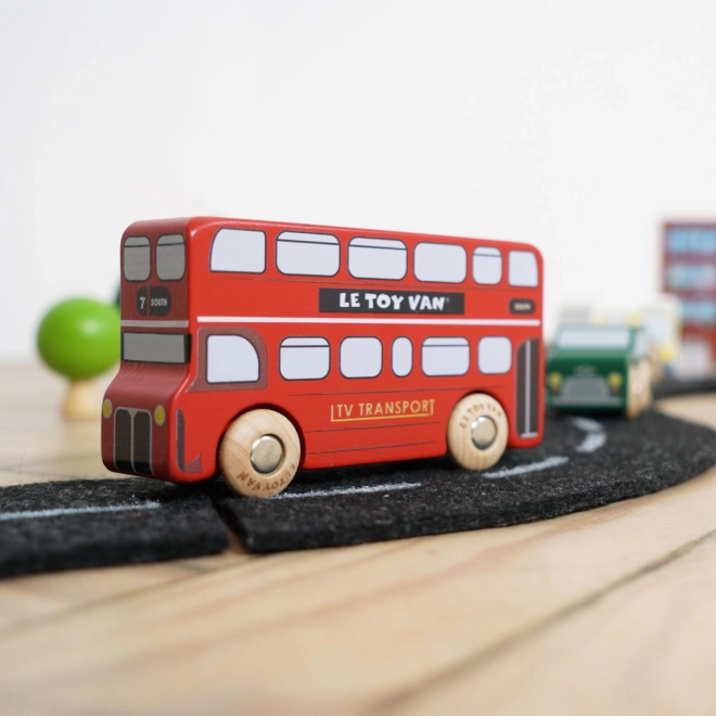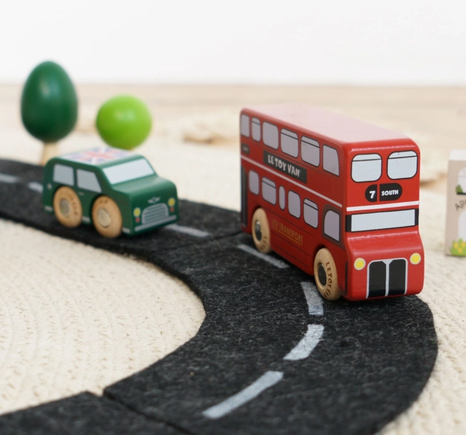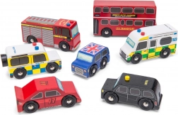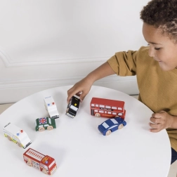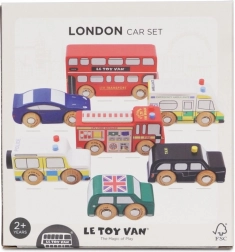 Odkryj świat tętniących życiem londyńskich ulic z dopracowanymi w detalach drewnianymi pojazdami od Le Toy Van. Zestaw obejmuje dwupiętrowy autobus, czarną taksówkę, wóz strażacki, karetkę, radiowóz oraz dwa samochody osobowe. Solidne wykonanie z trwałego, zrównoważonego drewna kauczukowego i gładkie krawędzie są idealne dla małych rączek, które podczas zabawy ćwiczą chwyt, koordynację ręka–oko i wyobraźnię.