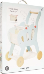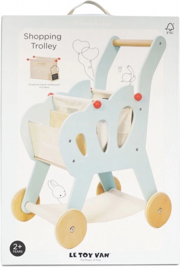 Stylowy drewniany wózek sklepowy LE TOY VAN w pastelowym błękicie pobudza zabawy w odgrywanie ról, rozwija motorykę małą oraz umiejętności społeczne. Oferuje dwie wewnętrzne przegródki, dolną przestrzeń do przechowywania, materiałową torbę oraz małą tabliczkę na listę zakupów. Wykonany z drewna certyfikowanego FSC, bezpiecznie zaokrąglony, ręcznie domalowywany nietoksycznymi farbami na bazie wody.