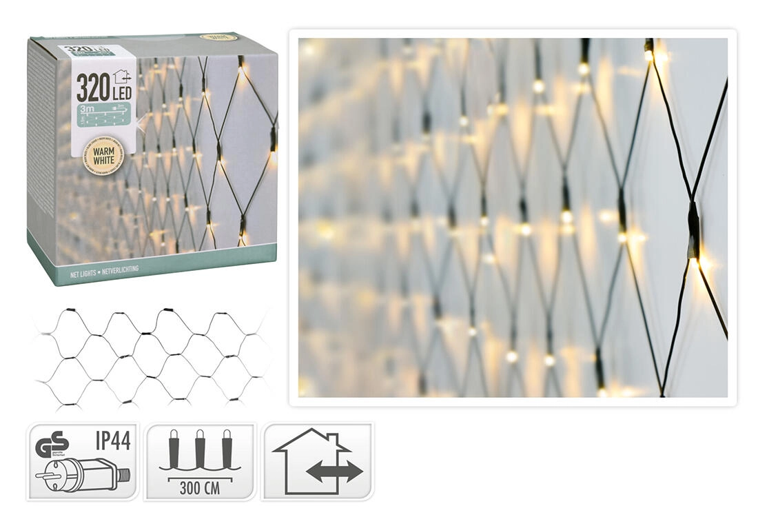 Uczyń swój dom i ogród bardziej przytulnymi dzięki świątecznej LED-owej siatce świetlnej o wymiarach 1,5 × 3 m z 320 diodami LED w przyjemnej ciepłej bieli. Dzięki klasie ochrony IP44 nadaje się do użytku wewnątrz i na zewnątrz, jest zasilana z gniazdka i ma 3‑metrowy przewód zasilający ułatwiający instalację.