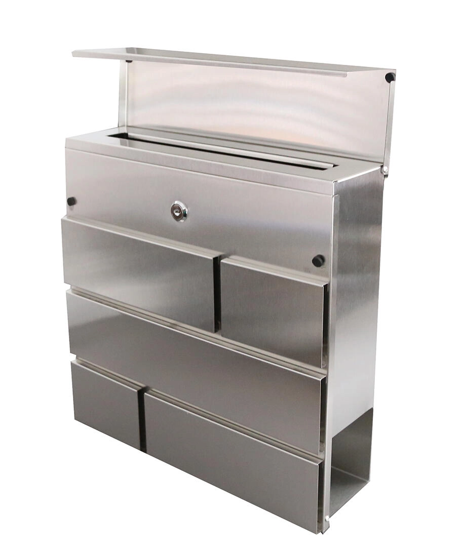 Nowoczesna skrzynka pocztowa z wysokiej jakości stali nierdzewnej do użytku zewnętrznego. Oferuje wrzut od góry, bezpieczne drzwiczki na klucz oraz łatwy montaż z dołączonymi śrubami i kołkami rozporowymi. W dolnej części znajduje się praktyczna przestrzeń na gazety i ulotki.