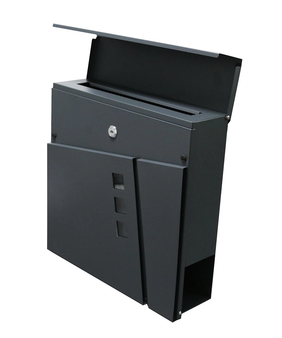 Nowoczesna skrzynka pocztowa TILES w eleganckim kolorze antracytu do bezpiecznego odbioru korespondencji. Oferuje wrzut od góry, zamek cylindryczny z 2 kluczami oraz łatwy montaż wraz ze śrubami i kołkami rozporowymi. W dolnej części posiada praktyczny tubus na gazety i ulotki.