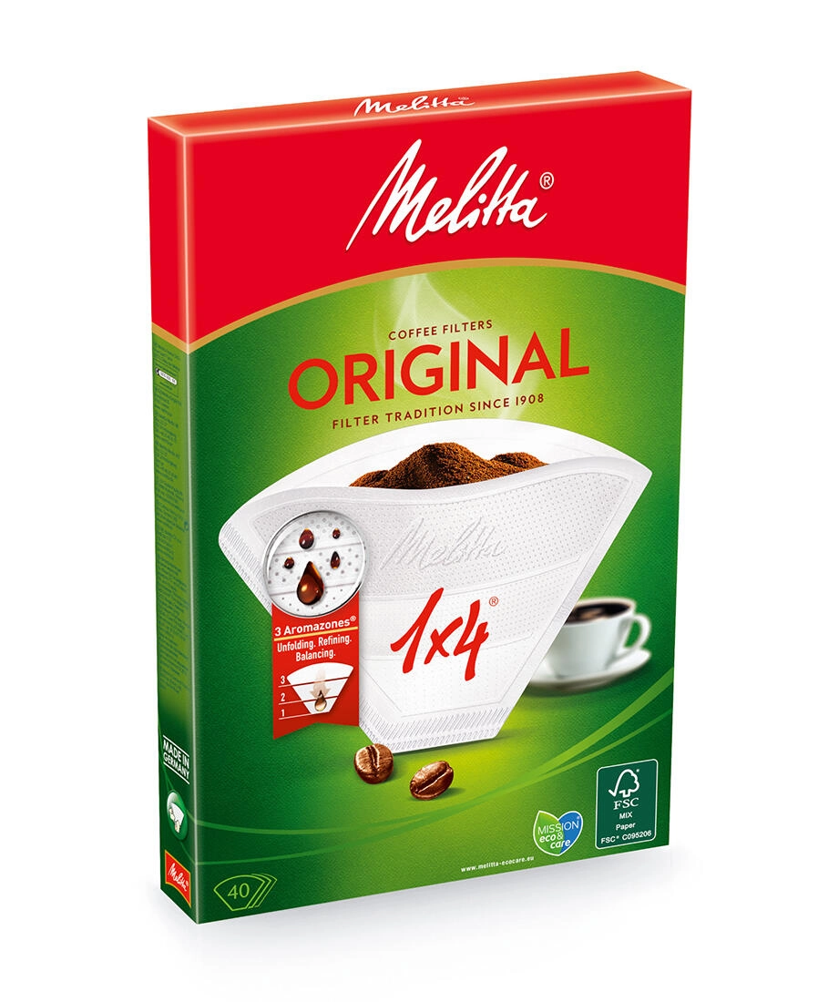 Wysokiej jakości papierowe filtry MELITTA Original w rozmiarze 4 dla czystej, aromatycznej kawy. Dzięki papierowi Aromapor przepuszczają tylko aromat i smak, podczas gdy niepożądane osady pozostają w filtrze. Wytrzymałe, niezawodne i kompatybilne z przelewowym ekspresami wszystkich marek.