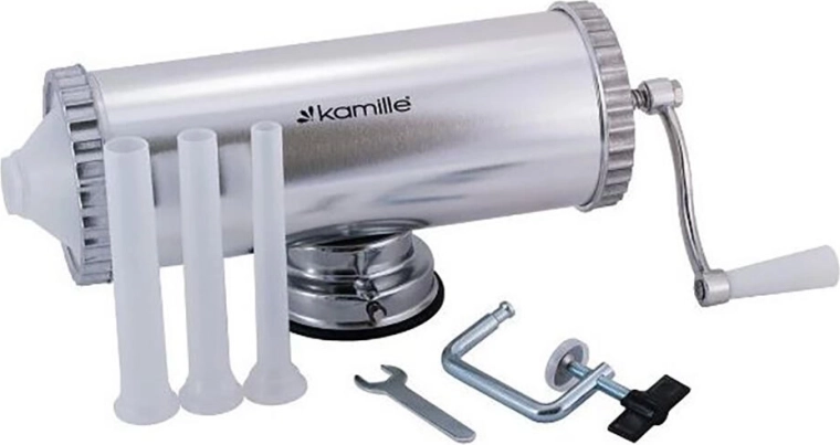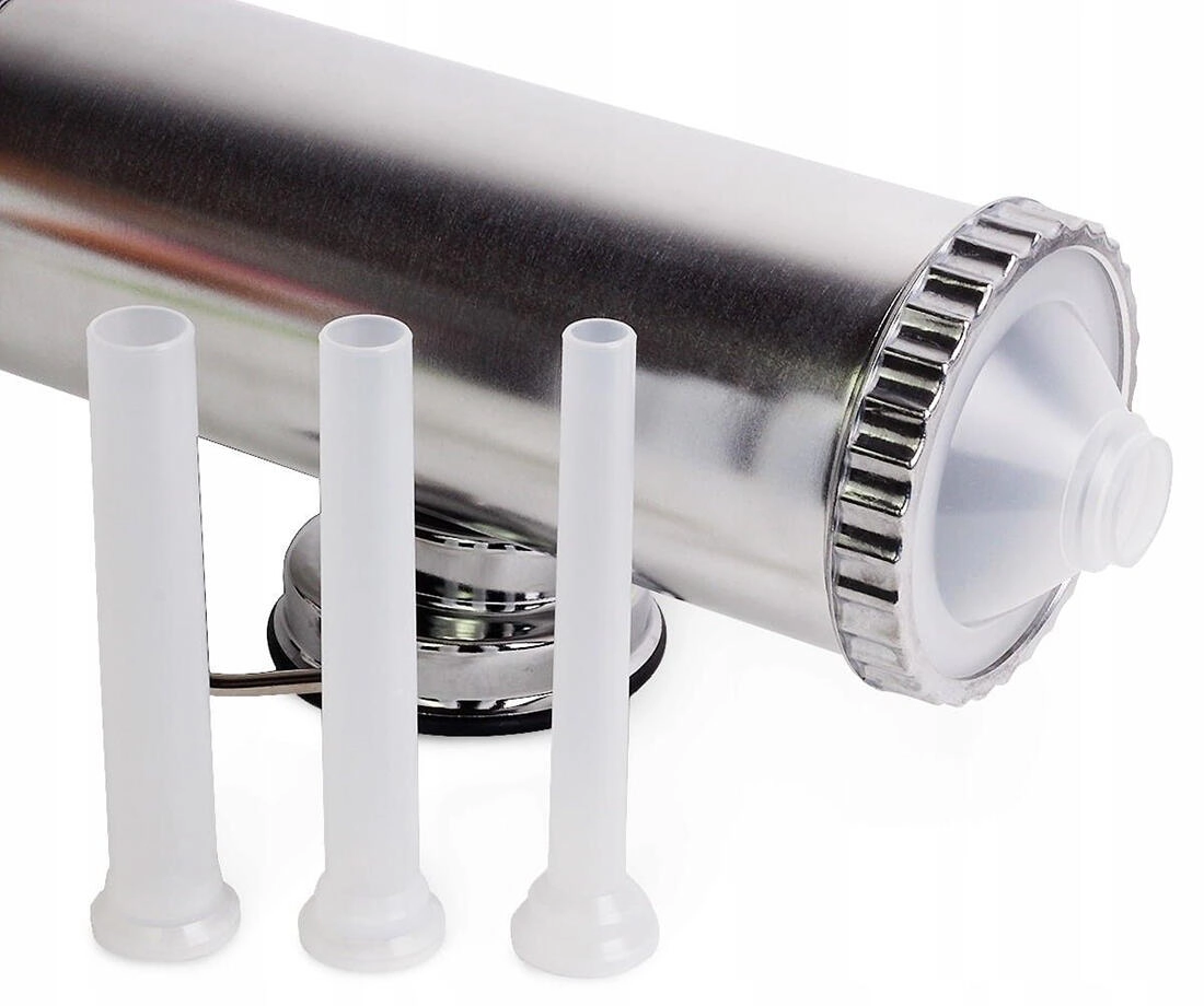 Stabilność podczas pracy zapewnia mocna przyssawka oraz możliwość mocowania śrubowego. W zestawie znajdują się 3 nasadki o różnych średnicach do napełniania kaszanki, cienkich kiełbasek i kabanosów. Wymienne rurki ułatwiają szybką zmianę rozmiaru w zależności od przepisu i typu osłonki.