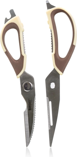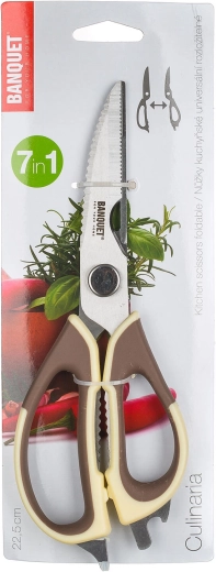 Praktyczne uniwersalne nożyczki kuchenne o długości 22,5 cm z możliwością rozłożenia dla łatwego czyszczenia i wszechstronnego zastosowania. Oferują ostre stalowe ostrza nierdzewne, ergonomiczne beżowo‑brązowe rękojeści oraz zintegrowane narzędzia do otwierania butelek, łuskania orzechów i cięcia drobiu.