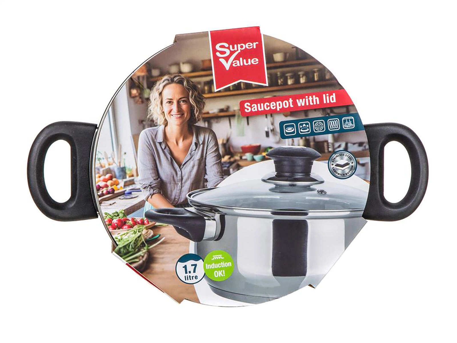 Praktyczny garnek nierdzewny SUPER VALUE o pojemności 1,7 l i średnicy 18 cm jest idealny do codziennego gotowania. Zapewnia równomierne rozprowadzanie ciepła, szklaną pokrywkę z zaworem pary do kontroli gotowania oraz odporne na ciepło uchwyty z bakelitu dla bezpiecznej obsługi. Nadaje się na wszystkie typy kuchenek, w tym indukcję, a po użyciu można go myć w zmywarce.