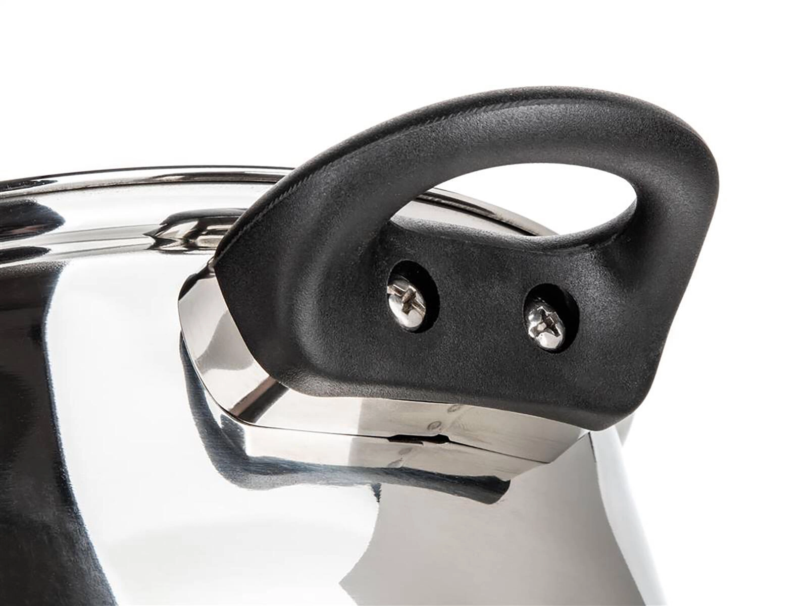 Ergonomiczne uchwyty z bakelitu oraz pokrętło pozostają chłodniejsze w dotyku i ułatwiają przenoszenie oraz manipulację.