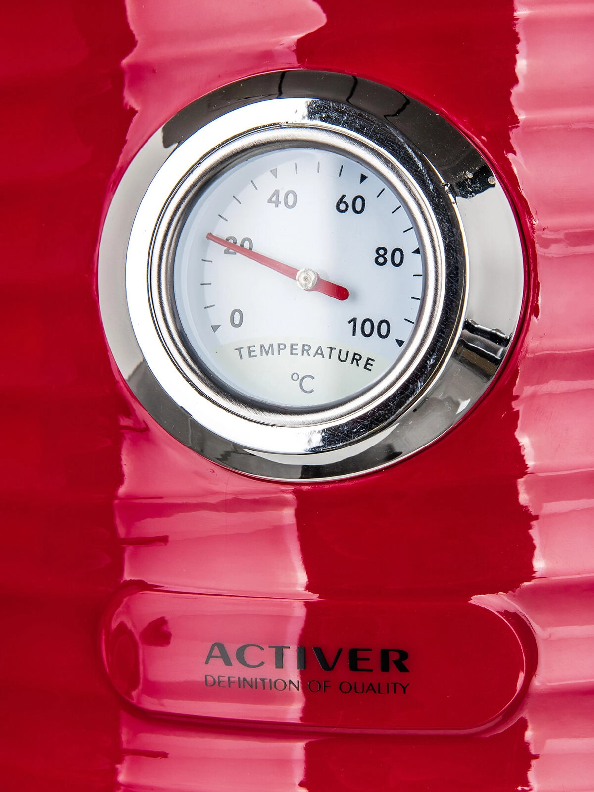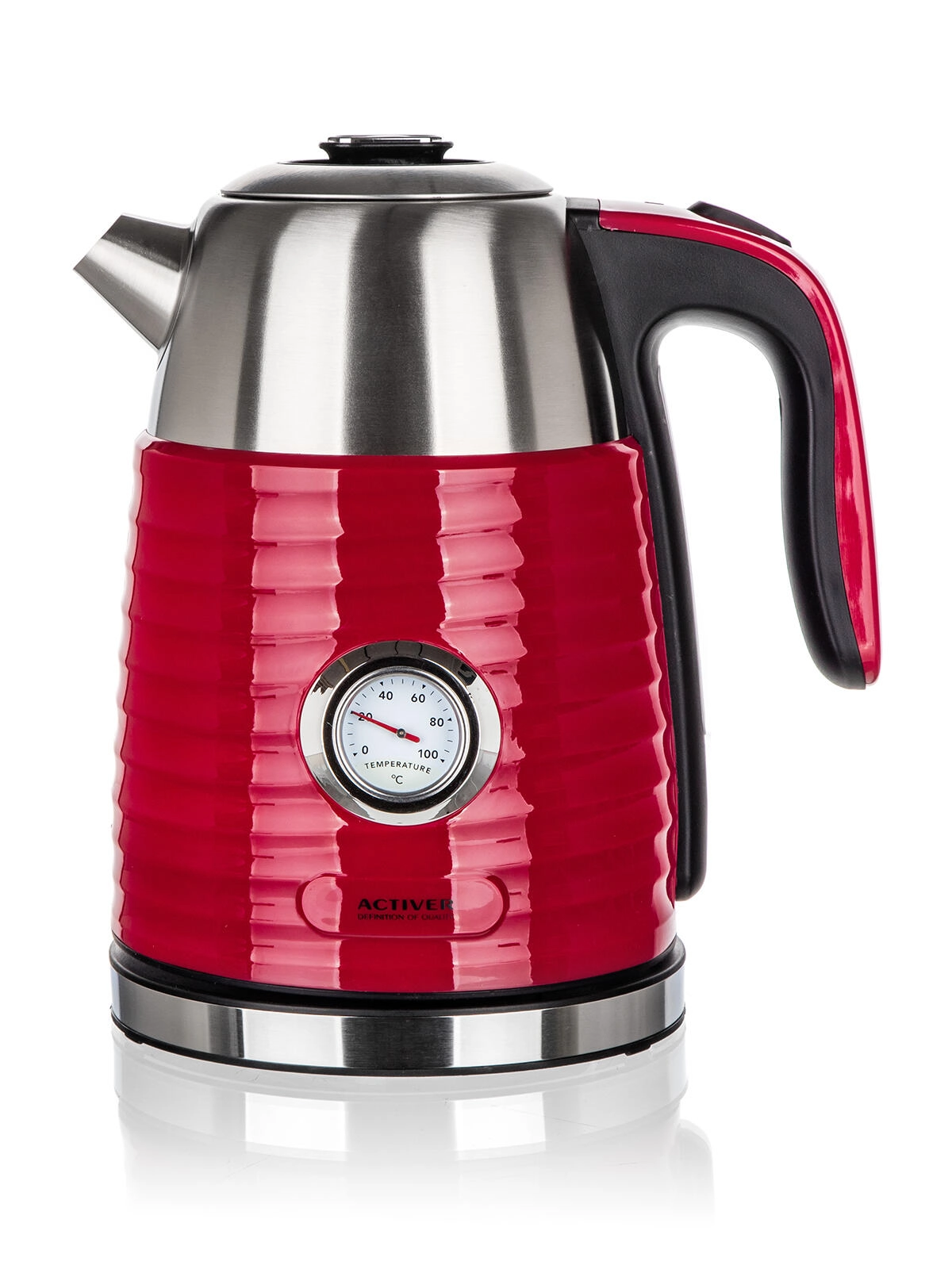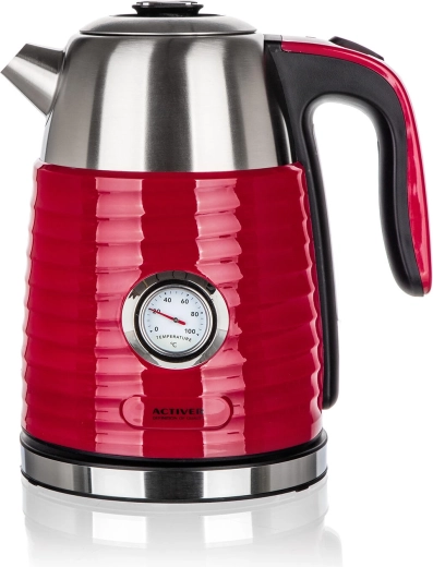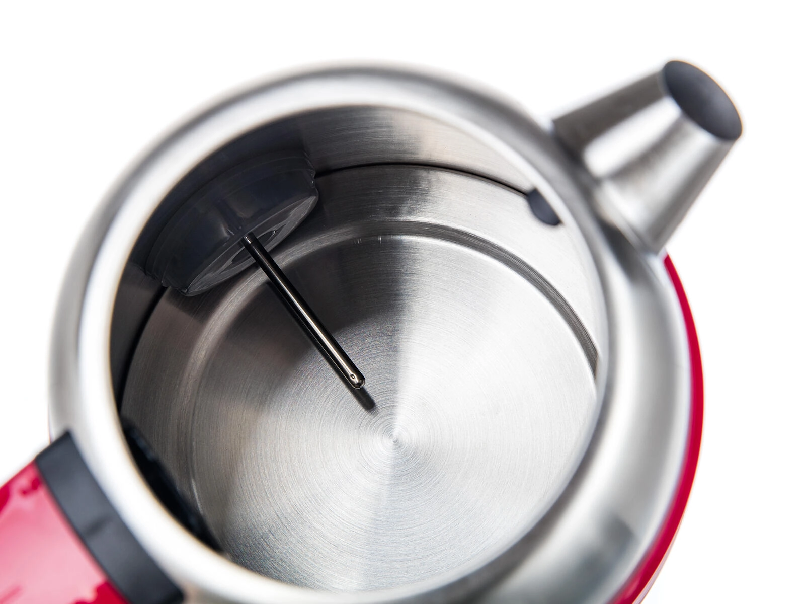 Czajnik elektryczny JUMPER o pojemności 1,7 l łączy eleganckie czerwone wykończenie z praktycznym, stalowym wnętrzem. Dwuścienna konstrukcja ogranicza ryzyko oparzenia przy przypadkowym dotyku, a jednocześnie lepiej utrzymuje wodę dłużej ciepłą do stopniowego serwowania. Zintegrowany analogowy termometr pozwala precyzyjnie monitorować temperaturę wody – idealny do przygotowania delikatnych herbat, kawy czy napojów instant.