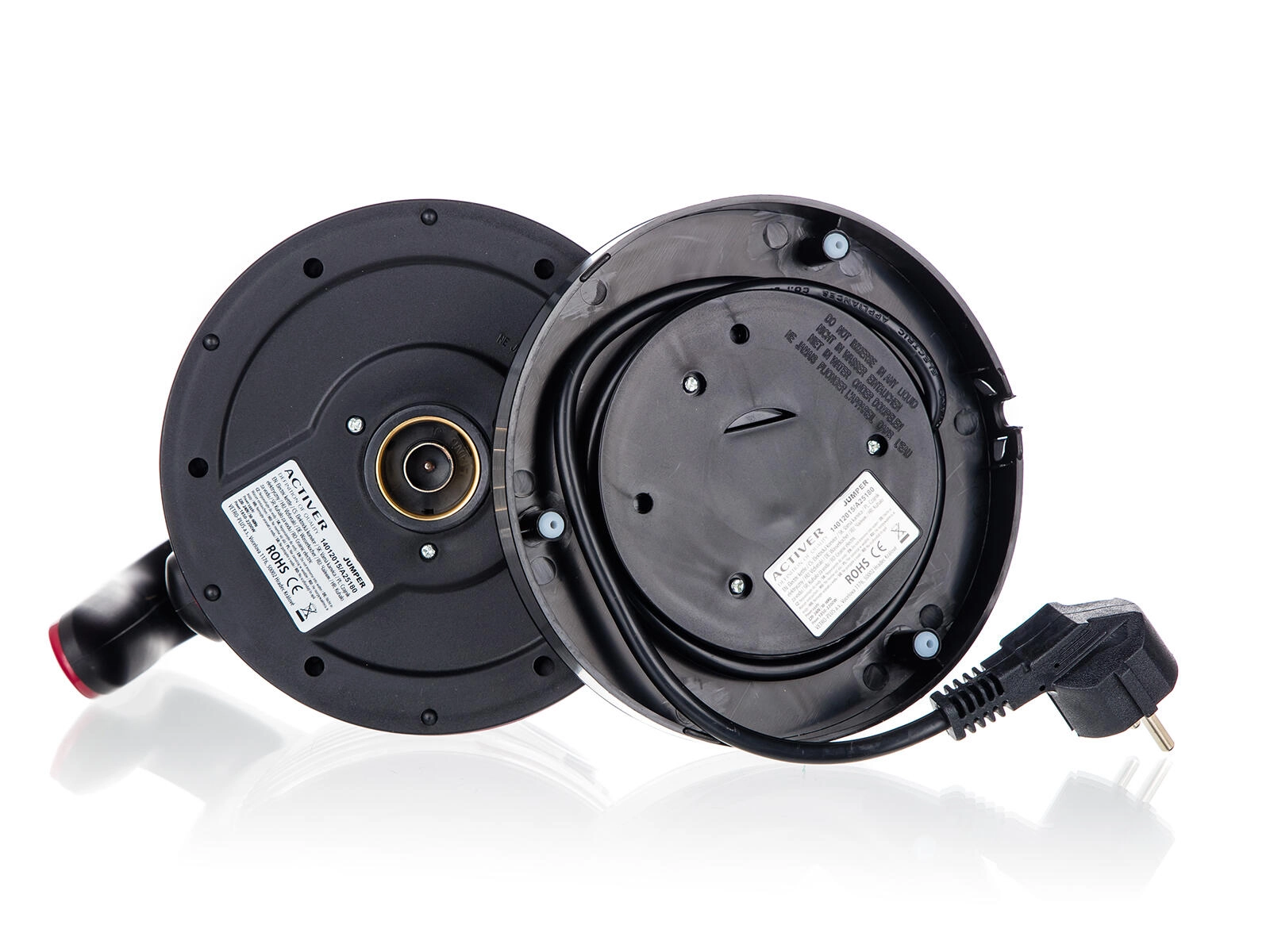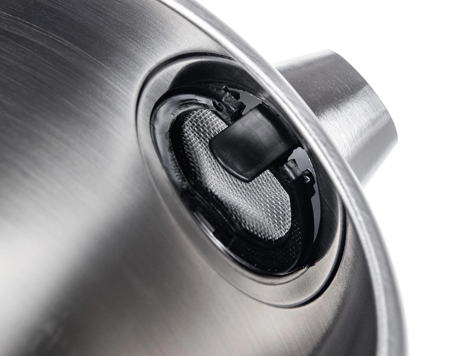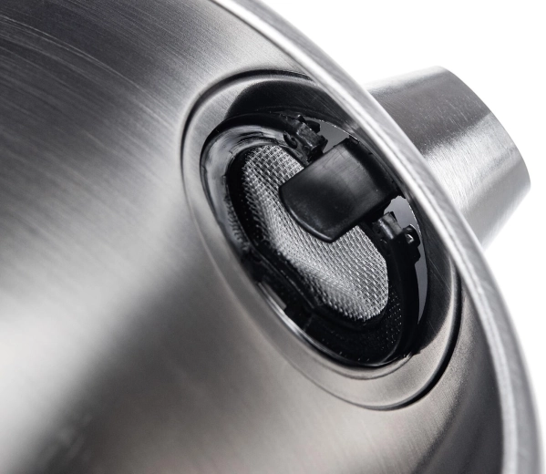 Czajnik oferuje moc 1850–2200 W dla szybkiego doprowadzenia wody do wrzenia, posiada płaskie dno ułatwiające czyszczenie oraz podstawę ze złączem centralnym dla wygodnego osadzania w zakresie 360° z dowolnego kierunku. Automatyczne i ręczne wyłączanie oraz zabezpieczenie przed przegrzaniem podnoszą bezpieczeństwo codziennego użytkowania. Wbudowany filtr zatrzymuje większe zanieczyszczenia i ułatwia czyste nalewanie bez osadów.
