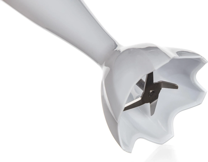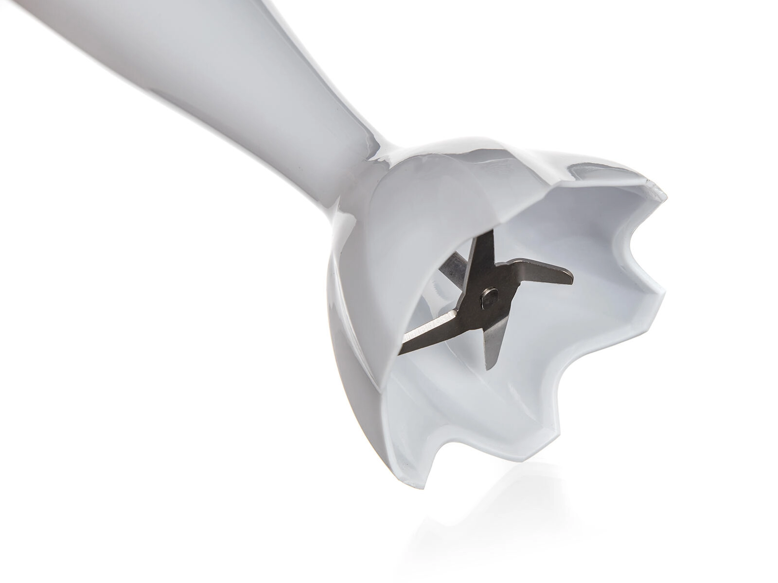 Profilowana głowica blendująca z osłoną ogranicza chlapanie i chroni powierzchnię naczyń podczas pracy.